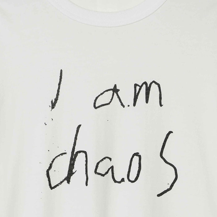 フロントに子供がハンドライティングで描いた様なI am chaosのグラフィックプリントを施したヌケ感のある1着。