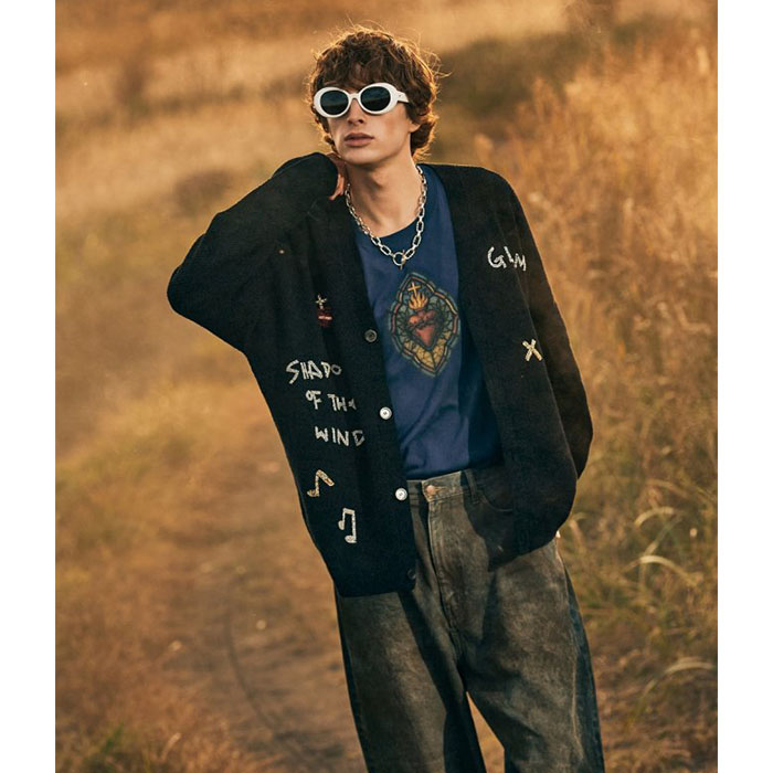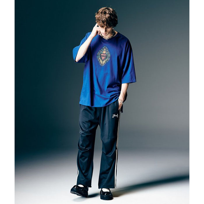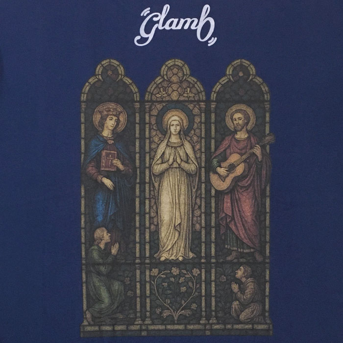 昨春に好評を博したStained Glass T-Shirtをウィットあるアイデアを掛け合わせてアップデートした1枚が登場。クラシカルなステンドグラスをデザインのベースとしながら、バックスタイル右列の人物は古楽器リュートではなく現代的なギターを演奏。フロントでは中南米カルチャーに見られるクロス&ハートモチーフをあしらい、古今東西のデザインミックスをコレクションに展開するglambらしい仕上がりとなっています。ボディに用いたのはUSライクなオープンエンド糸を6.2オンスミディアムウェイトに編み上げたコットン100%の天竺生地。着るほどに身体になじむ風合いが魅力となっております。シルエットは着丈を長めに、身幅を広めに設けたビッグシルエット。サイドにはスリットを設けており、動きやすさとスタイリング性をもたらします。