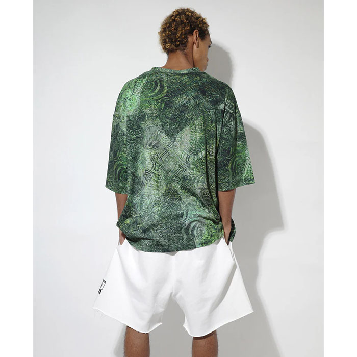 ワイドシルエットの総柄Tシャツ。