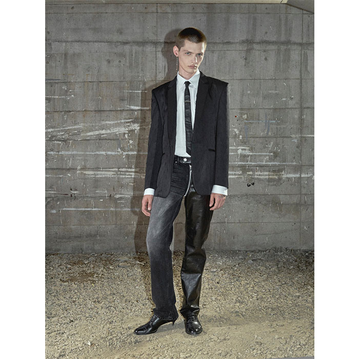 左右がセパレートでき、ルックのように同型別売のレザーパンツとドッキングカスタムも可能。