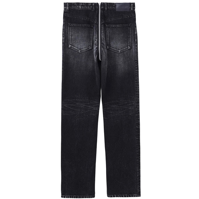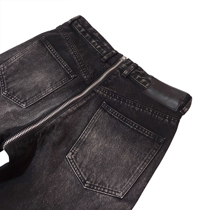 フロントからヒップまで大胆にジップを走らせたフェティッシュなデザインのデニムジップ5ポケットパンツ。