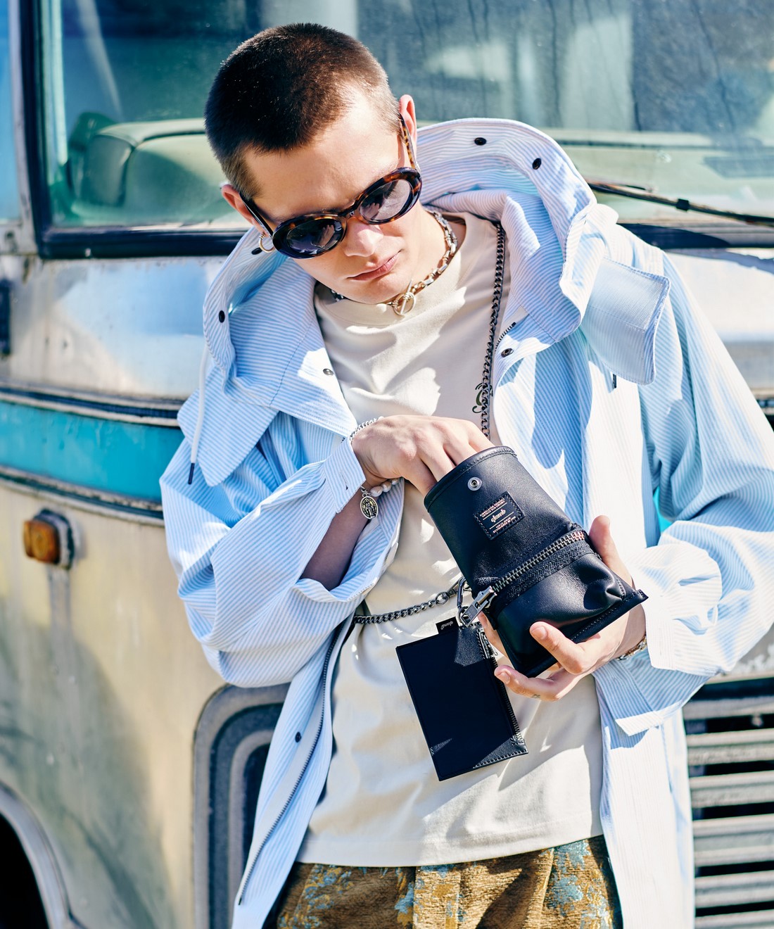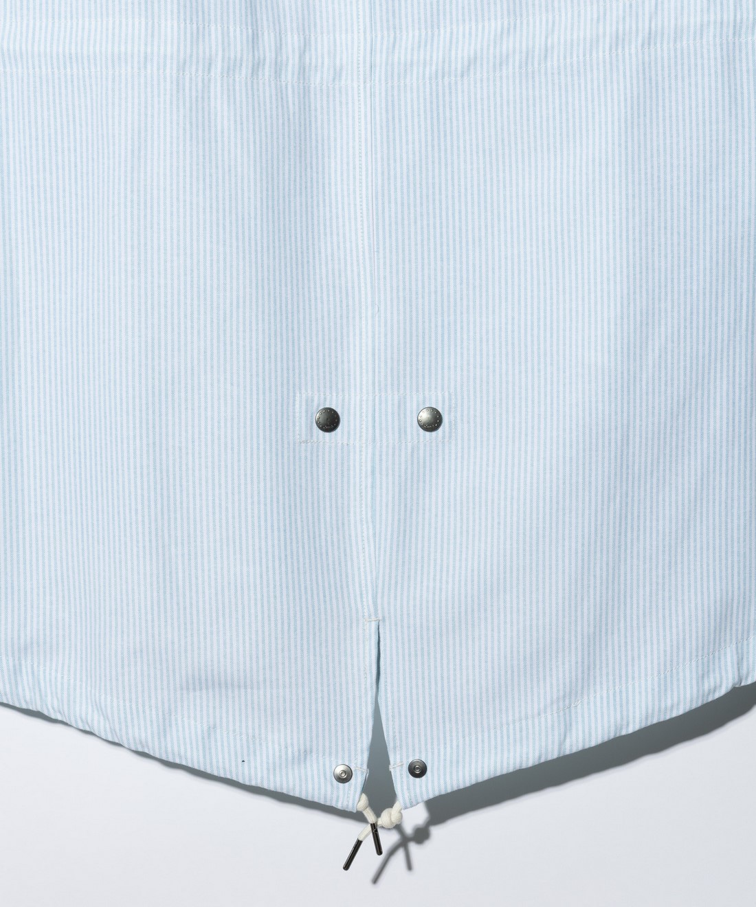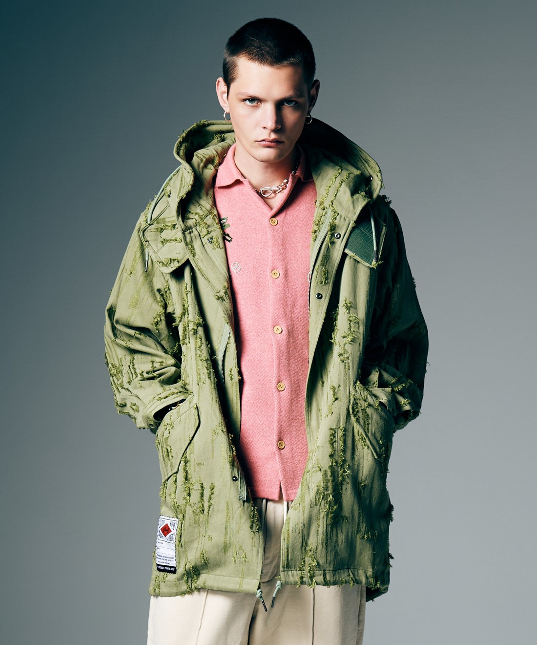 モッズカルチャーの象徴として1960年代ロンドンで隆盛を誇ったミリタリーコート“M-51”を、軽やかな生地使いで春夏のワードローブにアップデートしたHigh Neck Shirt Mods Coat。膝上丈のAラインシルエットに仕立てられたボディは随所でブランド定番ディテールを踏襲。首元で立体的な造形を見せるフードは顎位置を包む大振りのフラップと内部のワイヤーで形作ったもの。フード裏には飾りスナップも備えます。ウエスト位置はフラップポケットと片玉縁ポケットのWポケット仕様。デザインと機能性が一体となったアイデアが散りばめられています。各種ディテールはコート仕様ながら、本作はテキスタイルにシャツ地を使用。ペイズリー柄のGray、シャギーなルックスのKhaki、オックスフォード地のストライプを用いたBlueとカラーごとに異なるムードの生地をセレクトしました。袖口はシャツを踏襲したカフス仕様とすることで、袖を捲って春夏らしくアレンジできるスタイリング提案もプラス。前身頃の裾にはオールドスクールなデザインとブランドからの野心的なメッセージを乗せたスペックタグをあしらって仕上げました。