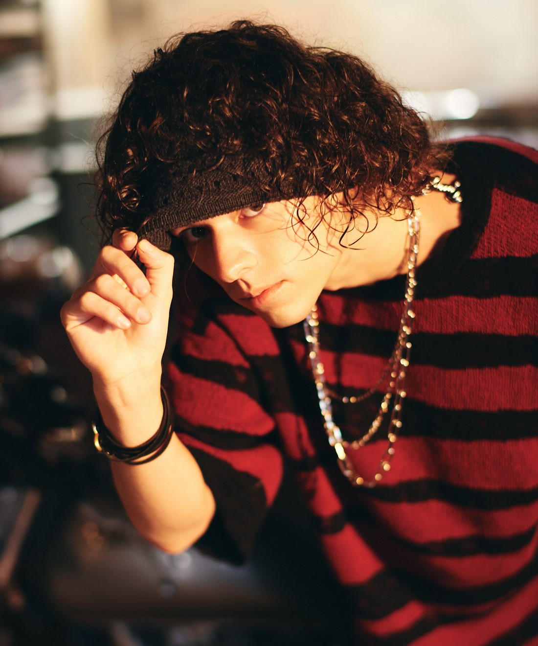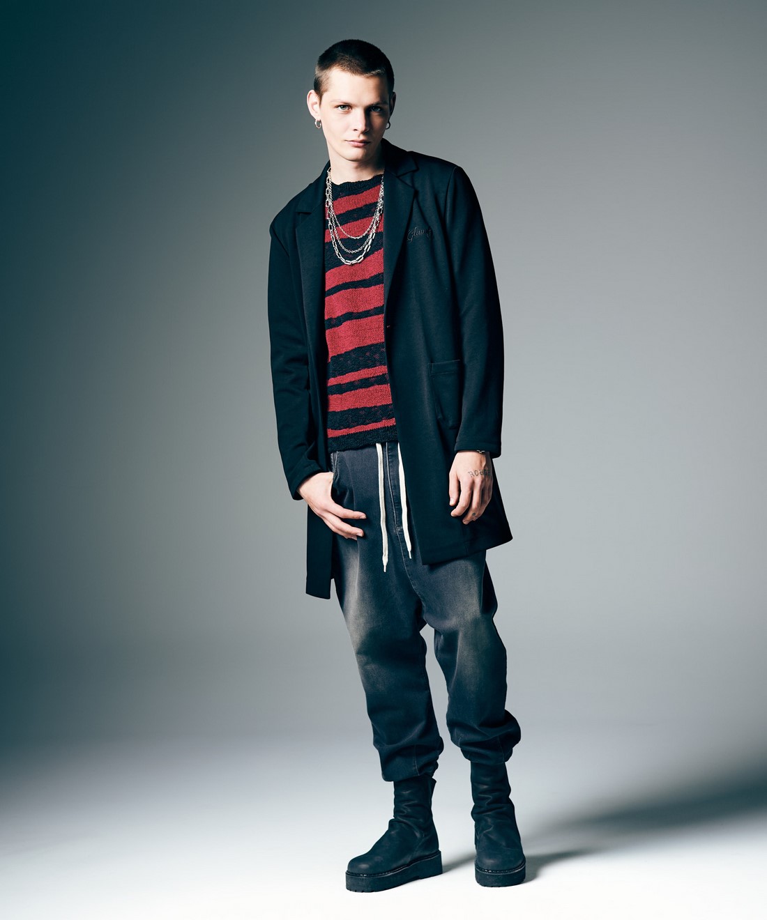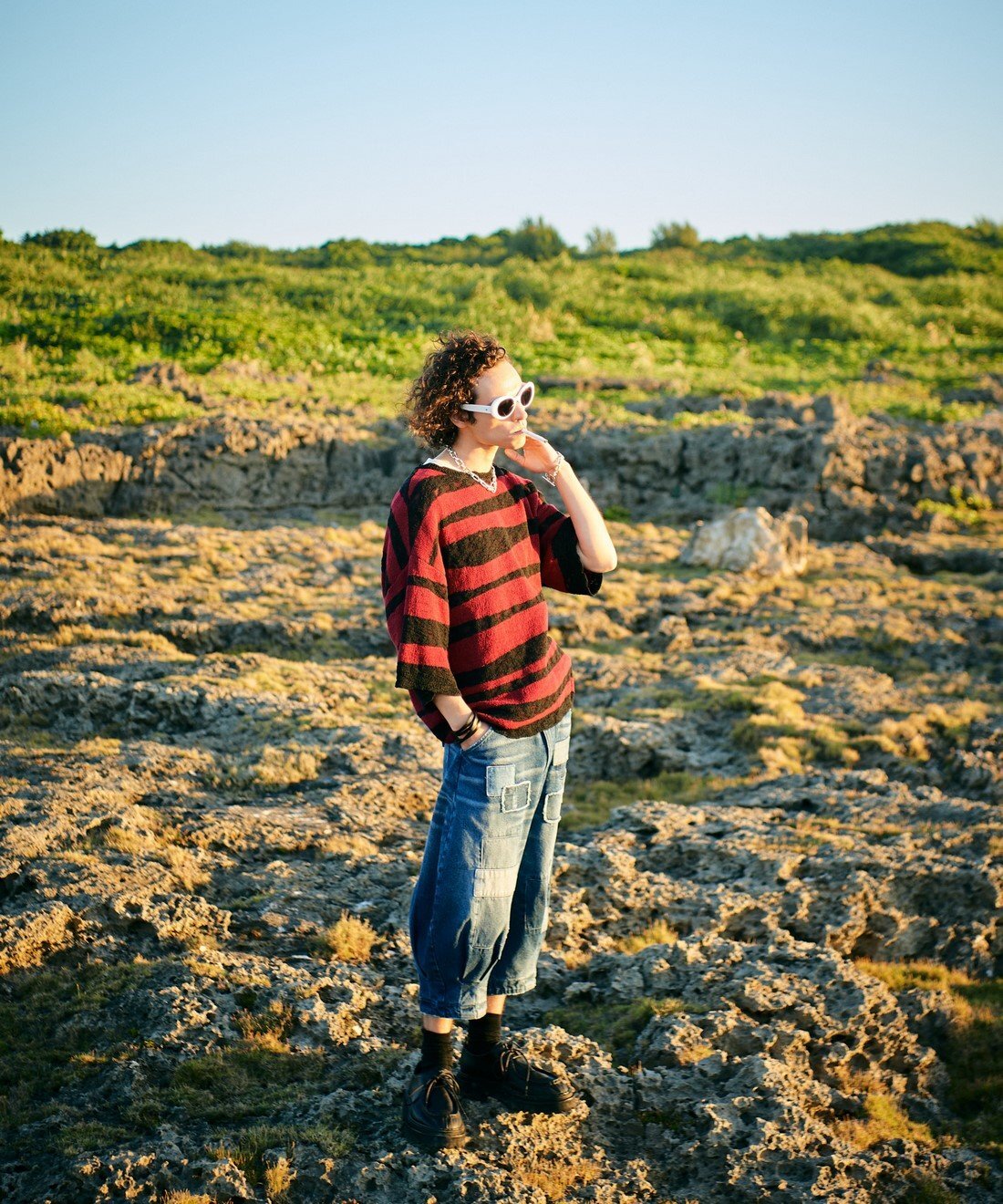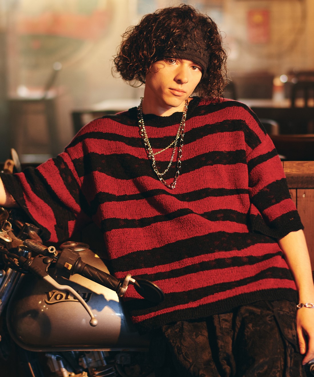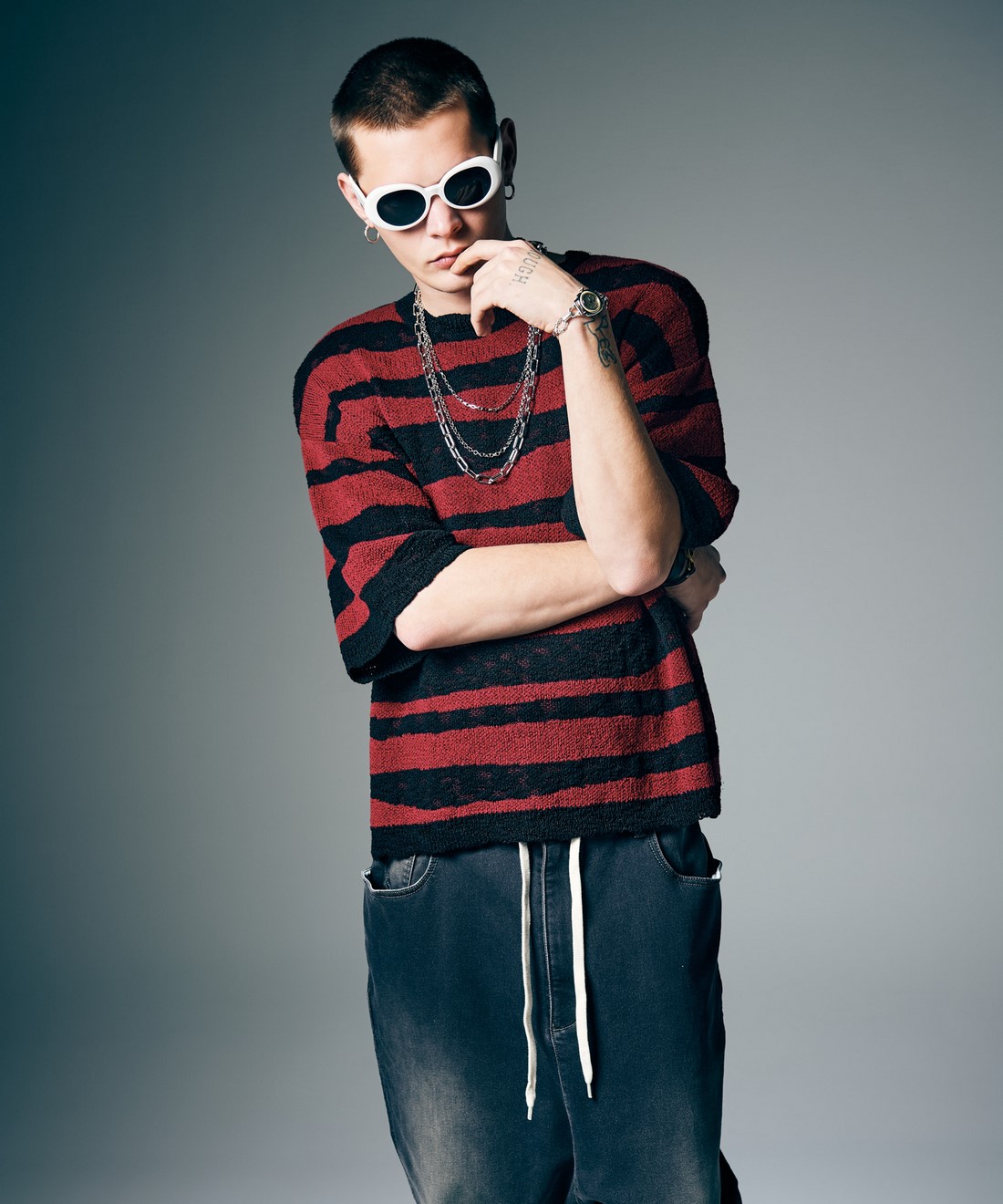グランジファッションの代名詞であるボーダーニットをアイデア溢れるニッティングで夏のストリートに提案するRandom Border Summer Knit。ドロップショルダーと六分袖を組み合わせたルーズシルエットのボディは、太さに不規則なムラを持ったスラブ糸をアクセントに構成。身頃をランダムに走るボーダーには透け感を、首元や袖のリブには歪んだ輪郭を演出します。編み技法は生地の表と裏に異なる糸を表出させることのできるダブルジャガードを使用。スラブ糸のみでは身生地に透けが出てしまいますが、本作は裏面にストレートな糸を用いてそれを防止するなど技術に根差した配慮を施しています。