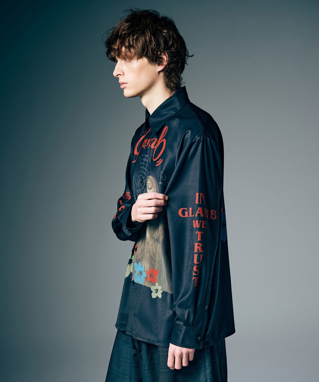 glambのブランド設立時からのモチーフである宗教画をドレスシャツへ大胆にあしらったPrayer Flower Shirt。シルキーな光沢を放つテキスタイルを用いたボディは、前身頃に祈りを捧げる女性とトロピカルな花々をプリント。その柄使いは後ろ身頃まで続いており、ブラックの身生地と楽園的なモチーフがミステリアスなコントラストを描きます。シルエットは着丈と身幅にゆとりを持たせたオーバーサイズ。タイトからワイドまでボトムスのシルエットを選ばずにスタイリングのまとまるサイジングに仕立てています。