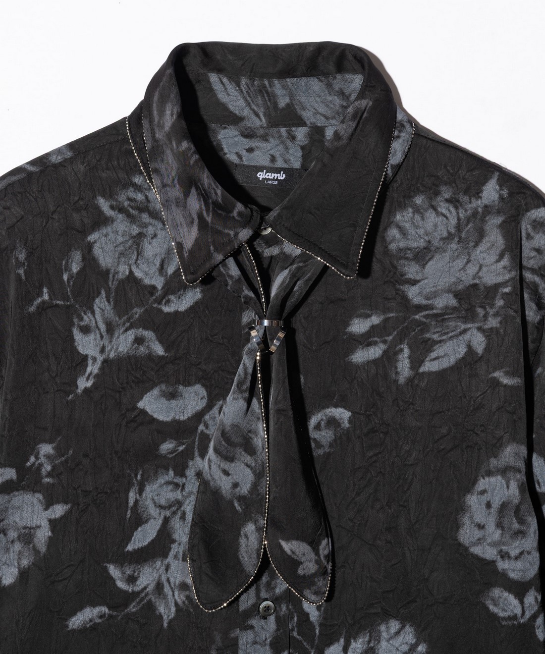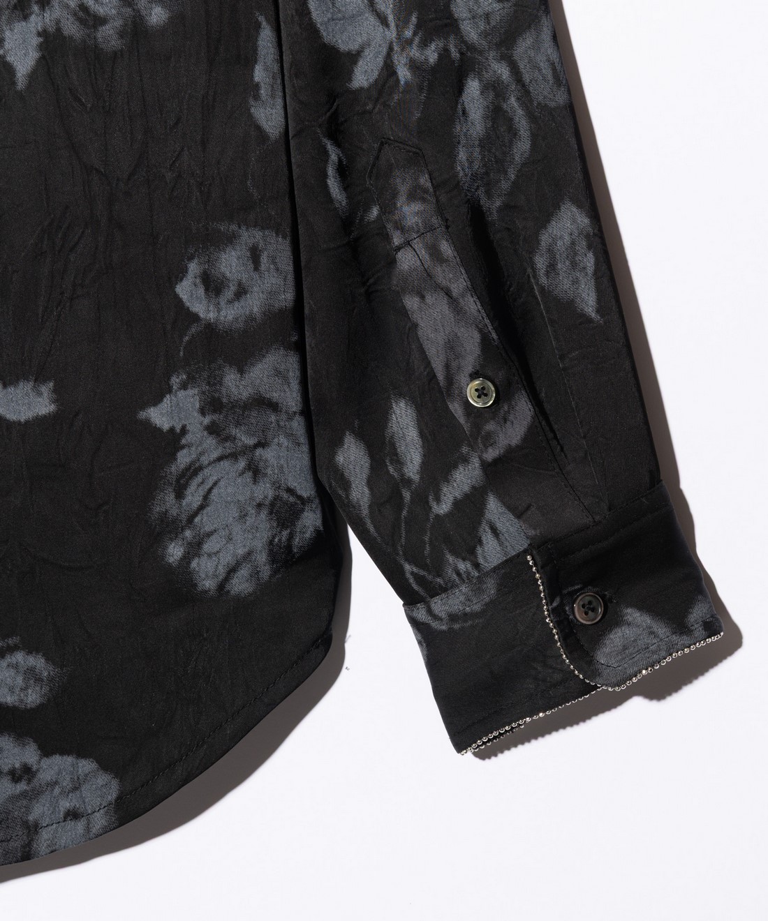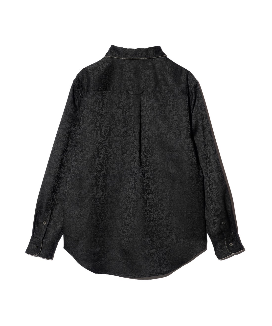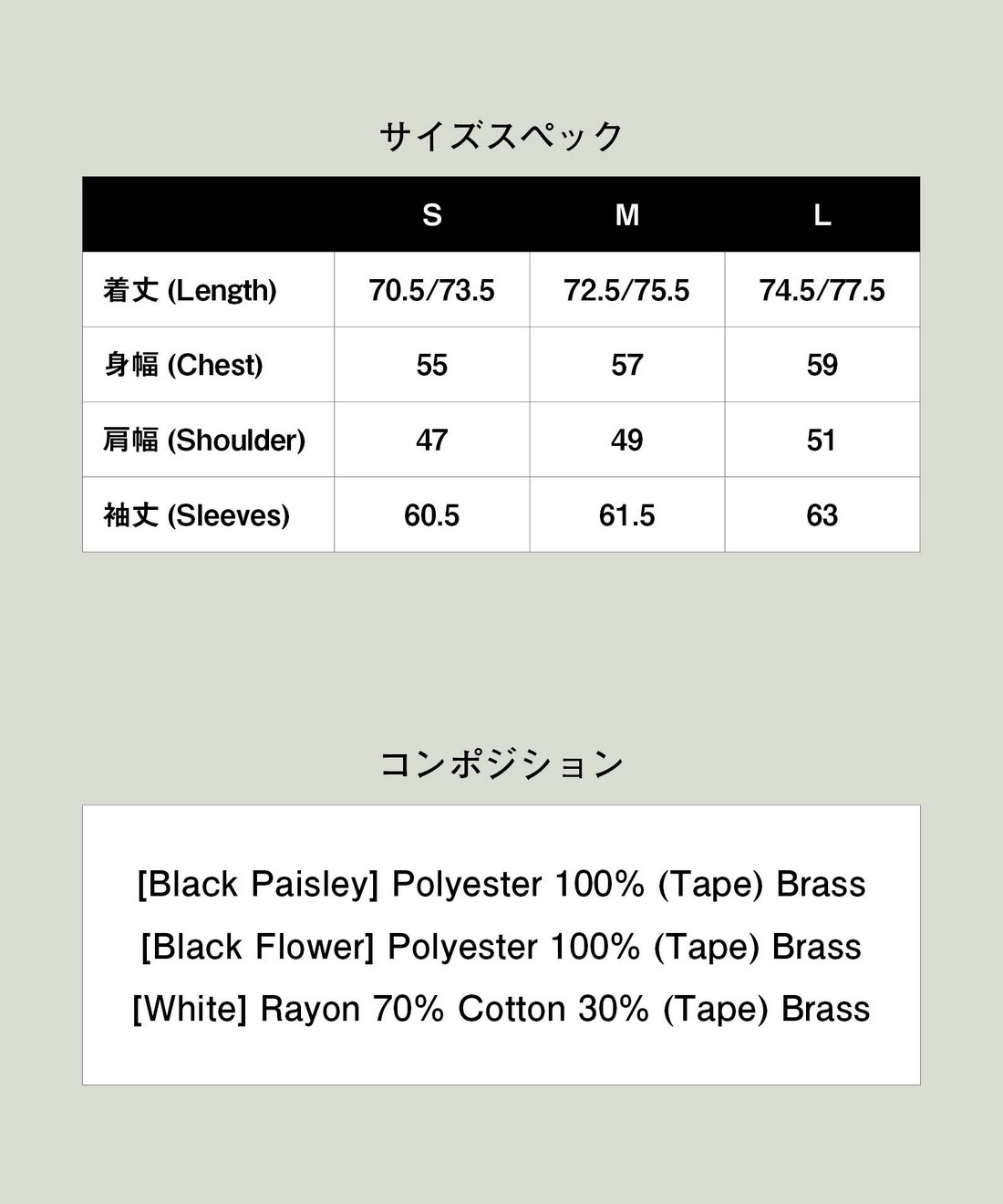 フォーマルファッションに対する煌びやかな解釈でロックマインドに溢れたシャツスタイルを提案するStuds Line Shirt。テキスタイルはWhiteには皺感あるこなれた風合いのレーヨンコットン、Black系の2色はいずれも総柄生地を使用。ゆとりある着丈と身幅を組み合わせたルーズシルエットのボディは、襟とカフスにスタッズテープを配してグラマラスなニュアンスを加えています。さらに身生地と同生地、同テープを配したスカーフをリングとともに付属。ブランドの美学を反映したトップススタイリングがこちら1枚で完成します。