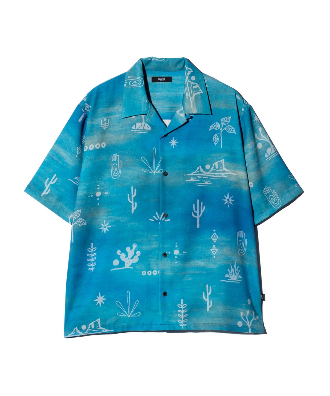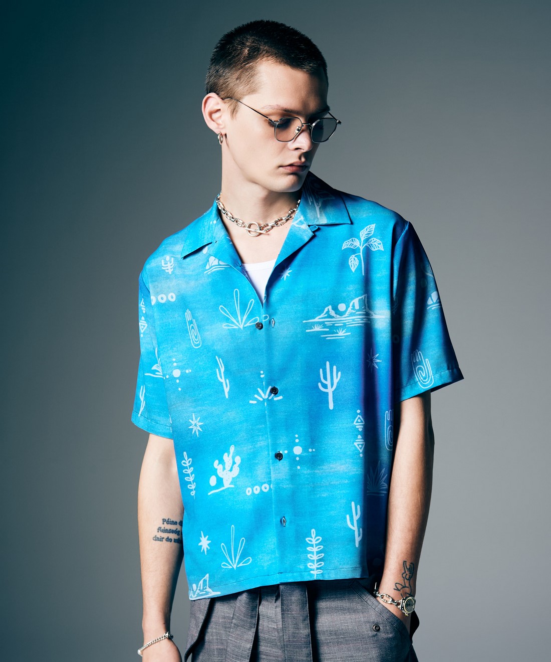 ハワイアン柄を夢見心地でシュールな世界観へと再描写したAbstract Hawaiian Shirt。プリミティブなタッチで散りばめられたのは植物や丘などアメリカの荒野を思わせるモチーフの数々。身生地は淡いグラデーションを施して、抽象的な世界観の総柄へとまとめました。ボディは身幅と着丈にゆとりを持たせたオーバーサイズシルエット。ストリートフレンドリーなサイジングと詩的な柄使いの組み合わせにより、リゾートスタイルからタウンユースまで幅広いシーンでご着用いただけるでしょう。