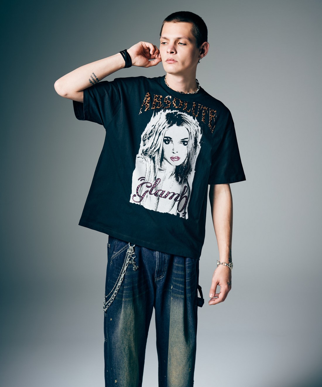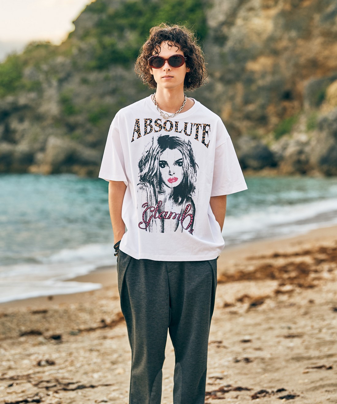 聴く者を圧倒するカリスマティックなアーティスト像をグラフィックに描き出すDiva T-Shirt。フロントにシュレッダーにかけたような効果を持たせて配したのは歌姫のポートレート。モノトーンの色使いでシンボリックに描きながら、唇とglambロゴのスターモチーフにはラメプリントを、"ABSOLUTE"ロゴにはベロアを用いて煌びやかに仕上げました。テキスタイルに用いたのは表面の毛羽立ちを極限まで抑えて上質で滑らかな肌触りをもたせたコットン100%コンパクトコーマ。ストリートフレンドリーなビッグシルエットは抜け感ある着こなしを演出します。