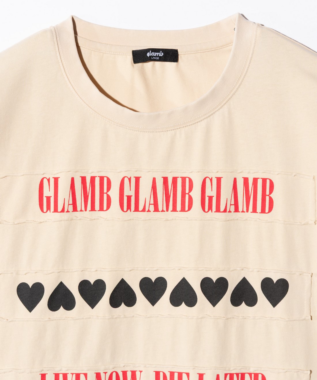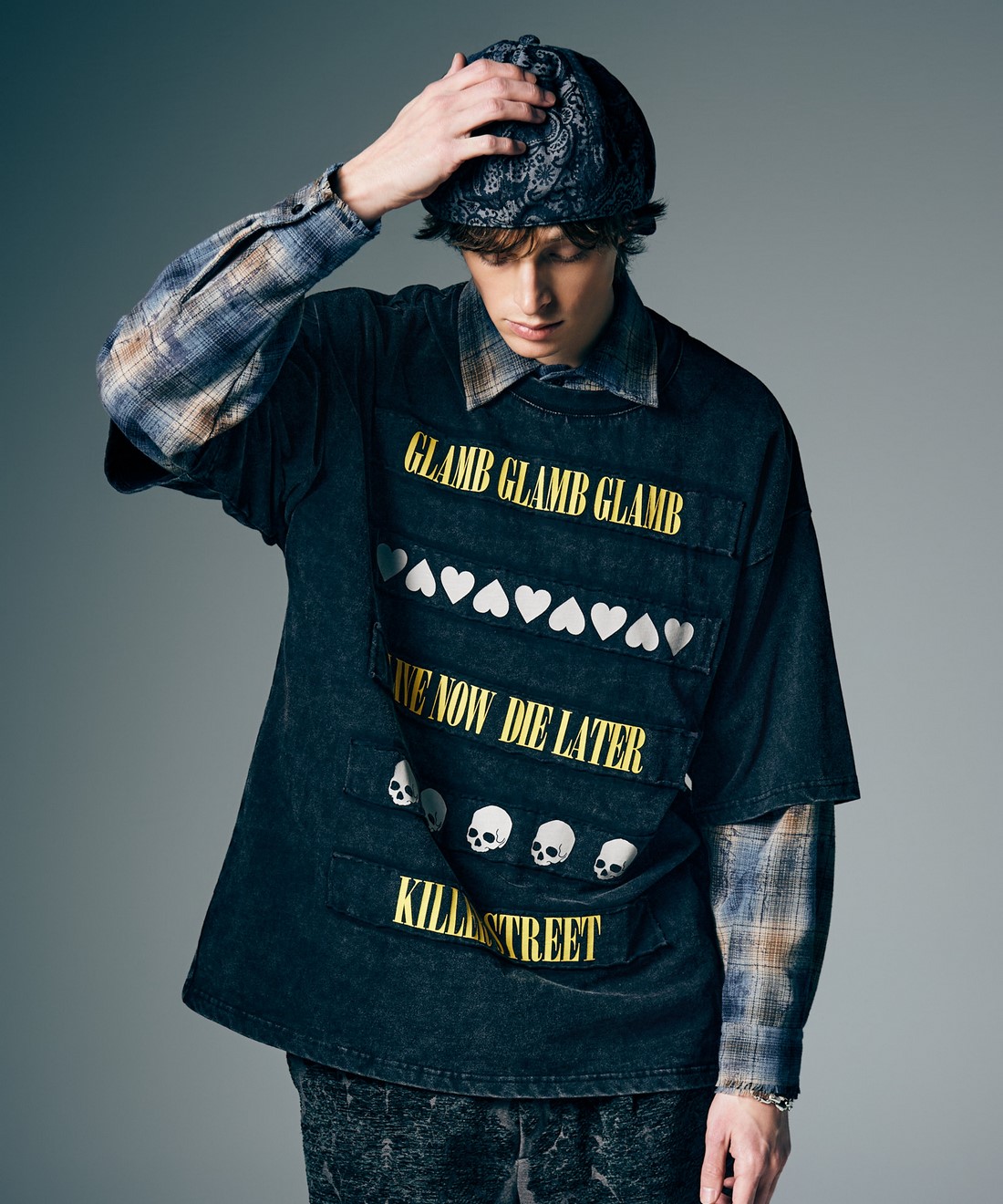 glambのブランドコンセプトとなるグランジを彷彿とさせるモチーフをグラフィカルなレイアウトで敷き詰めたSkull Heart T-Shirt。別生地で用意したボーダーパーツを身生地に縫いつけて表現した柄使いは洗いの工程を通すことで縁のダメージも演出。仕上げにパウダー加工を施してヴィンテージライクな表情に仕上げています。テキスタイルに用いたのはコットン100%のミディアムウェイト生地。ドロップショルダーに広めの身幅を掛け合わせたビッグシルエットがグランジらしいルーズなスタイリングをもたらします。