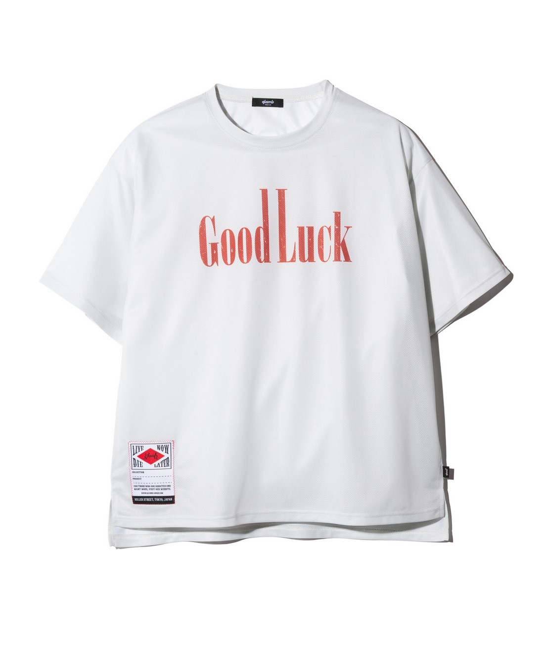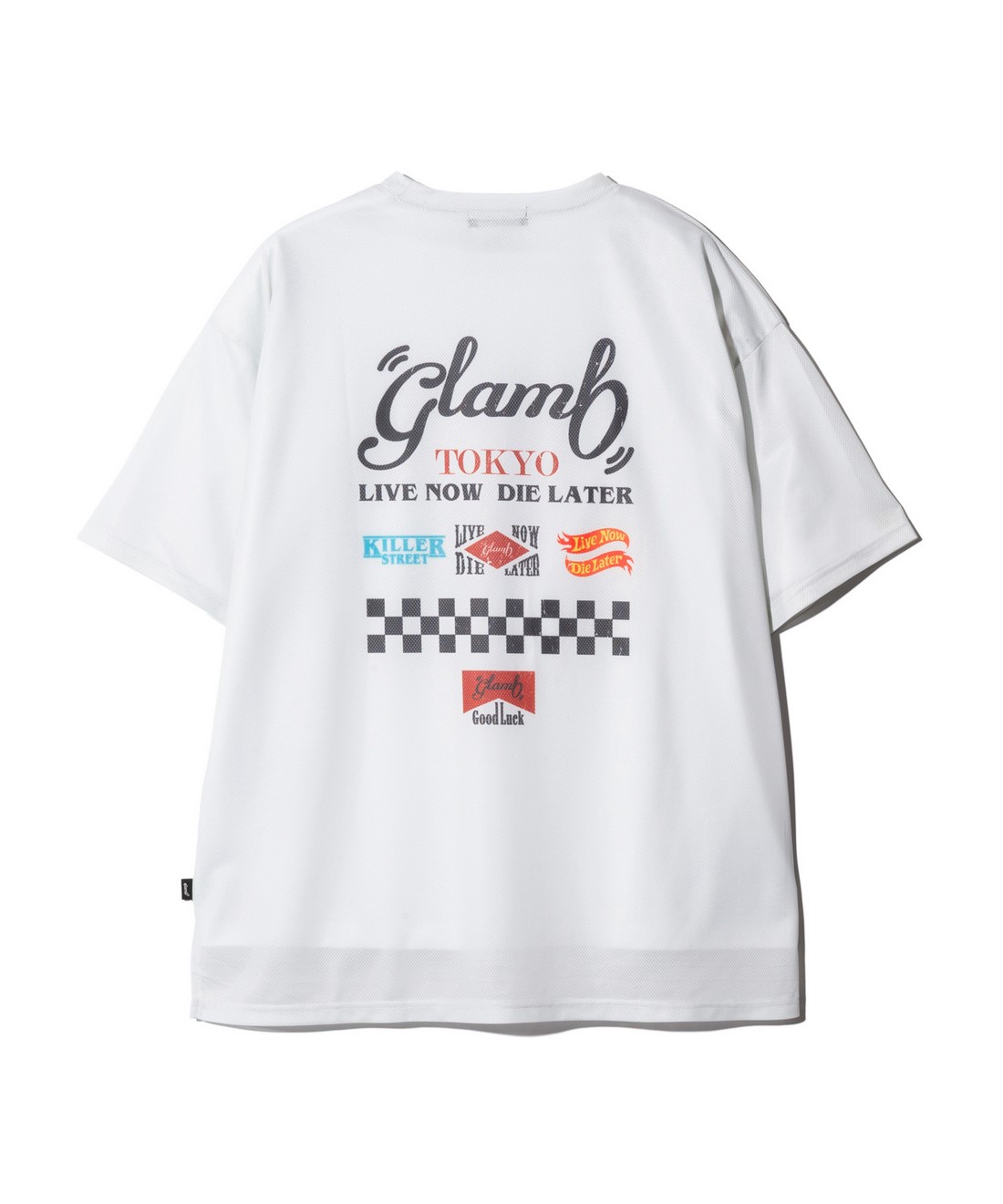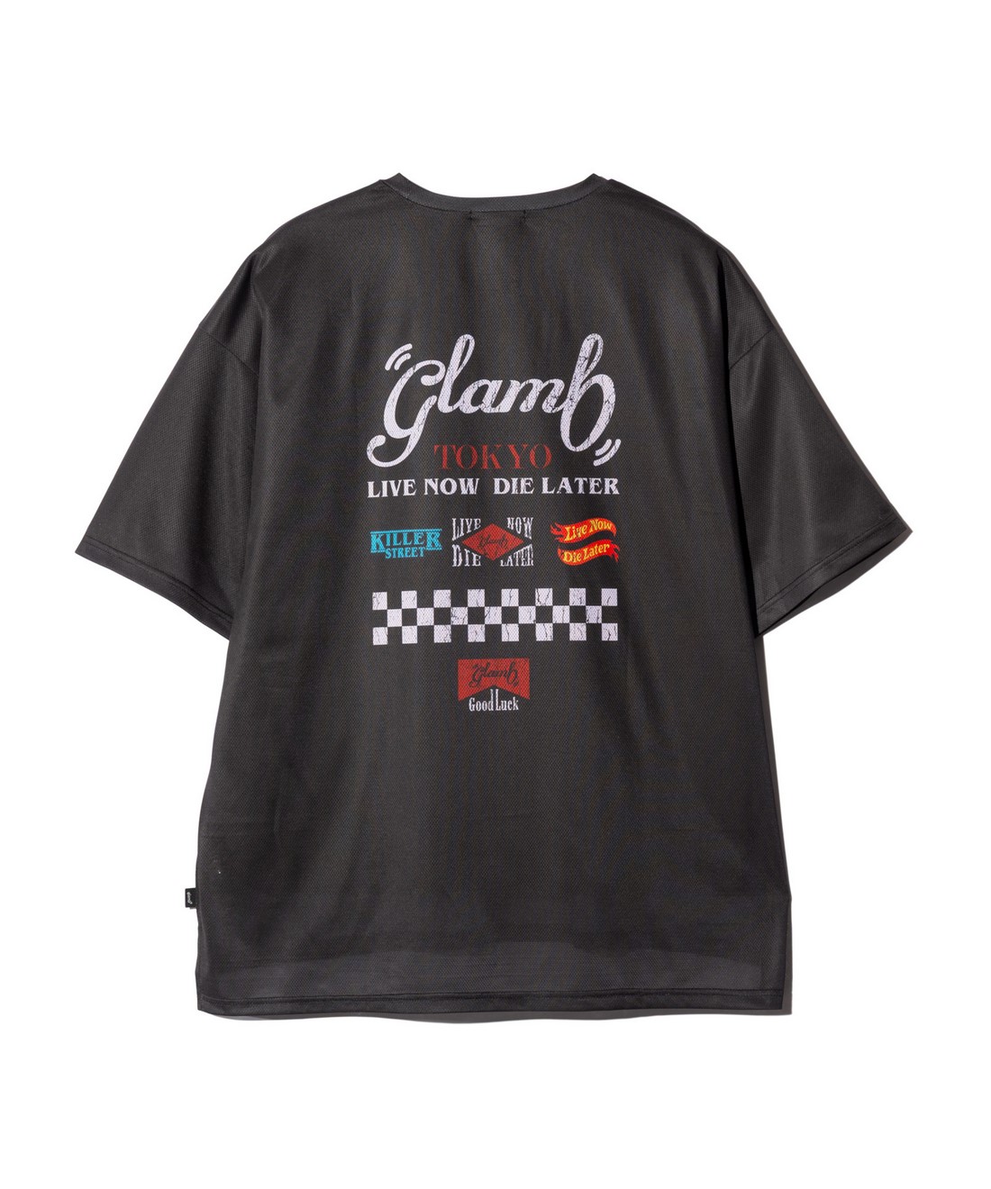 glambのカットソーラインを牽引する"Good Luck"シリーズをサマースタイルで新たに提案するGood Luck Mesh T-Shirt。ビッグシルエットのボディはテキスタイルに通気性に優れるメッシュ生地を使用。前後差を付けた裾のスリットと相まって軽やかな着用感をお楽しみいただけます。フロントにはシリーズロゴに加えて今季から登場するスペックタグをあしらい、タフな印象に。バックスタイルではレースチームをイメージしたロゴの数々に加えてチェッカー柄をデザインしており、疾走感あるルックを作り上げました。