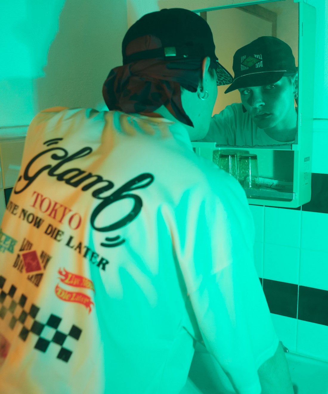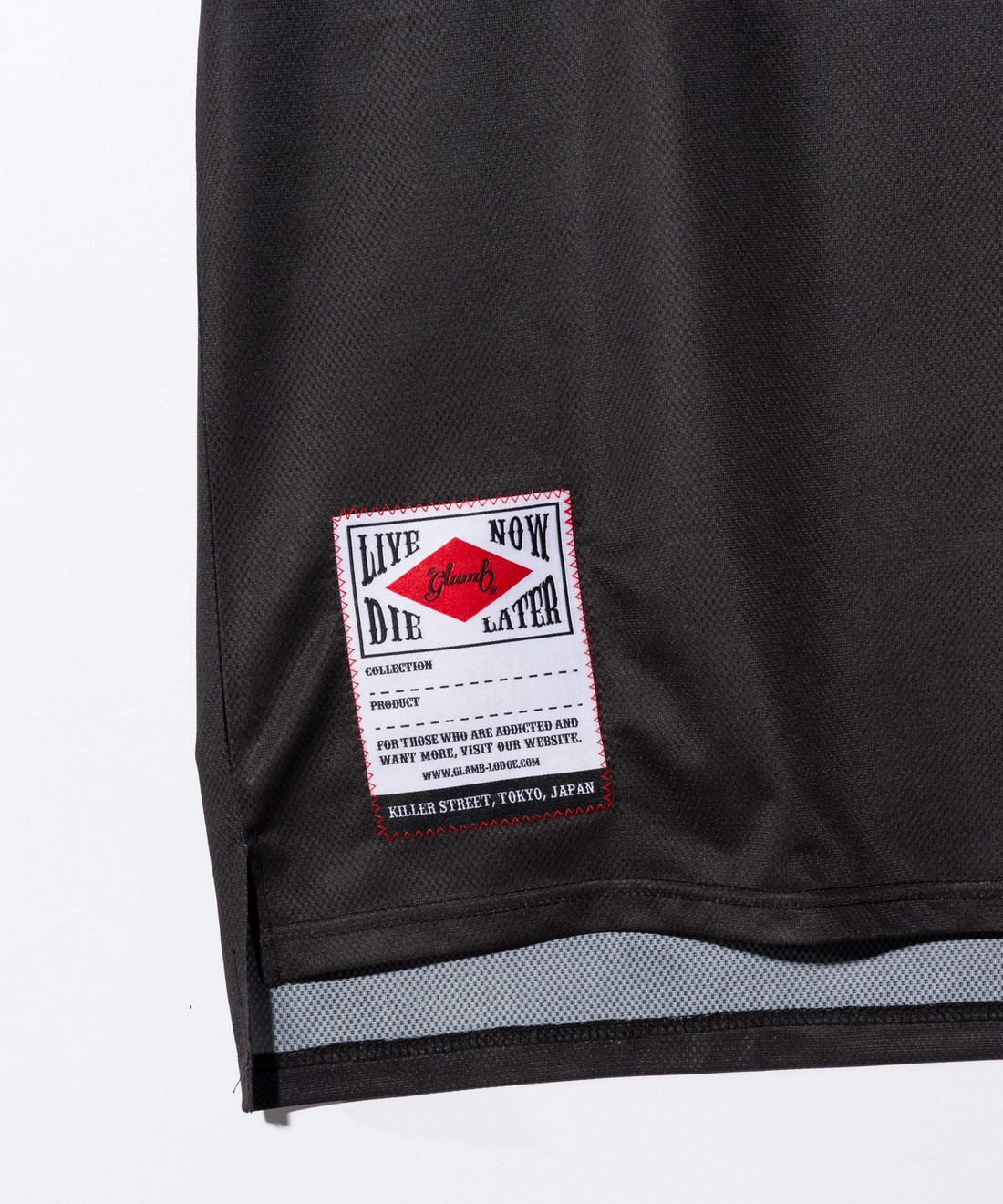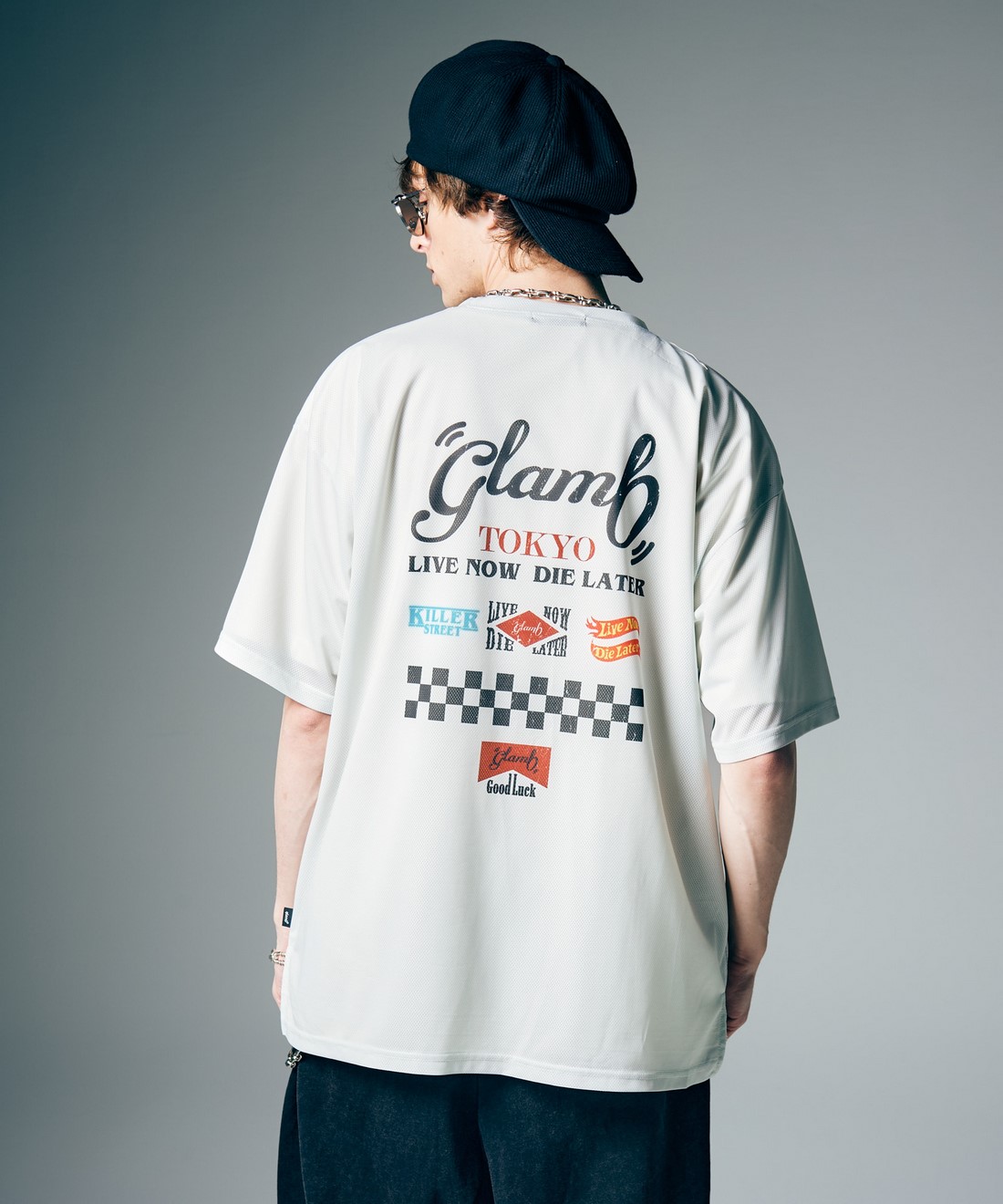 glambのカットソーラインを牽引する"Good Luck"シリーズをサマースタイルで新たに提案するGood Luck Mesh T-Shirt。ビッグシルエットのボディはテキスタイルに通気性に優れるメッシュ生地を使用。前後差を付けた裾のスリットと相まって軽やかな着用感をお楽しみいただけます。フロントにはシリーズロゴに加えて今季から登場するスペックタグをあしらい、タフな印象に。バックスタイルではレースチームをイメージしたロゴの数々に加えてチェッカー柄をデザインしており、疾走感あるルックを作り上げました。