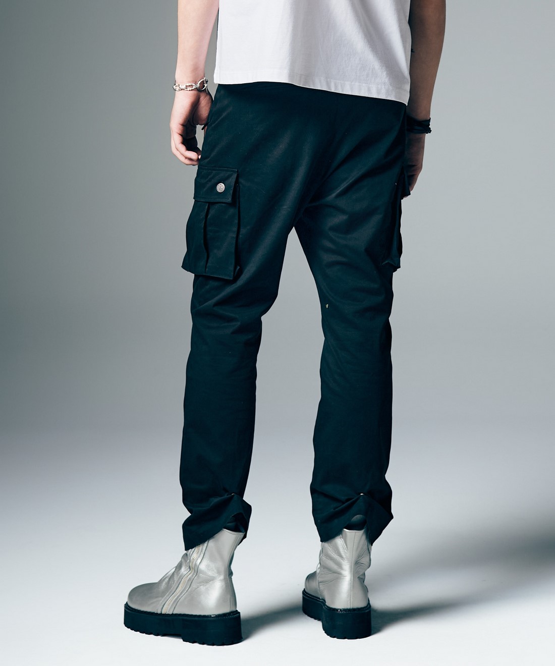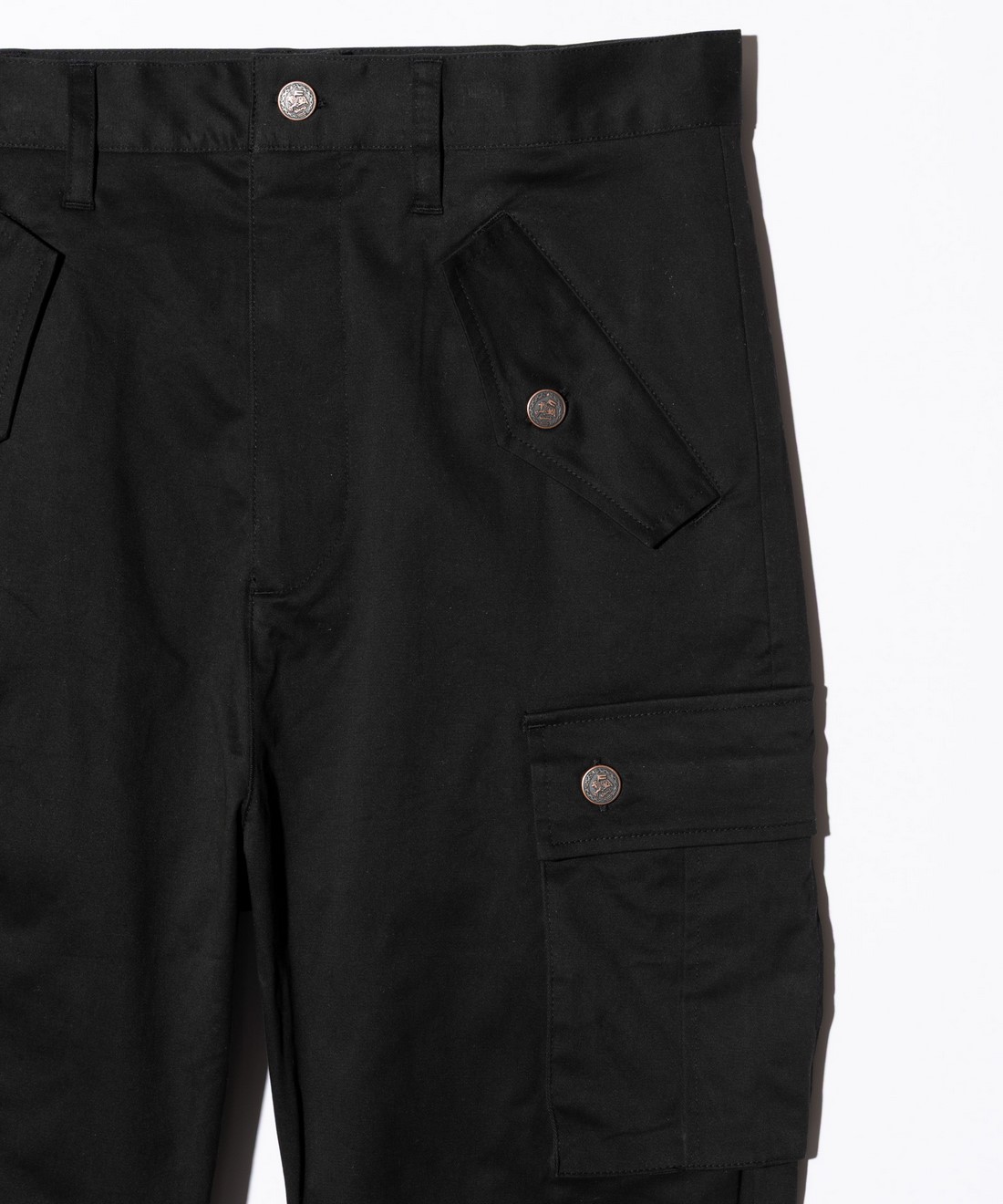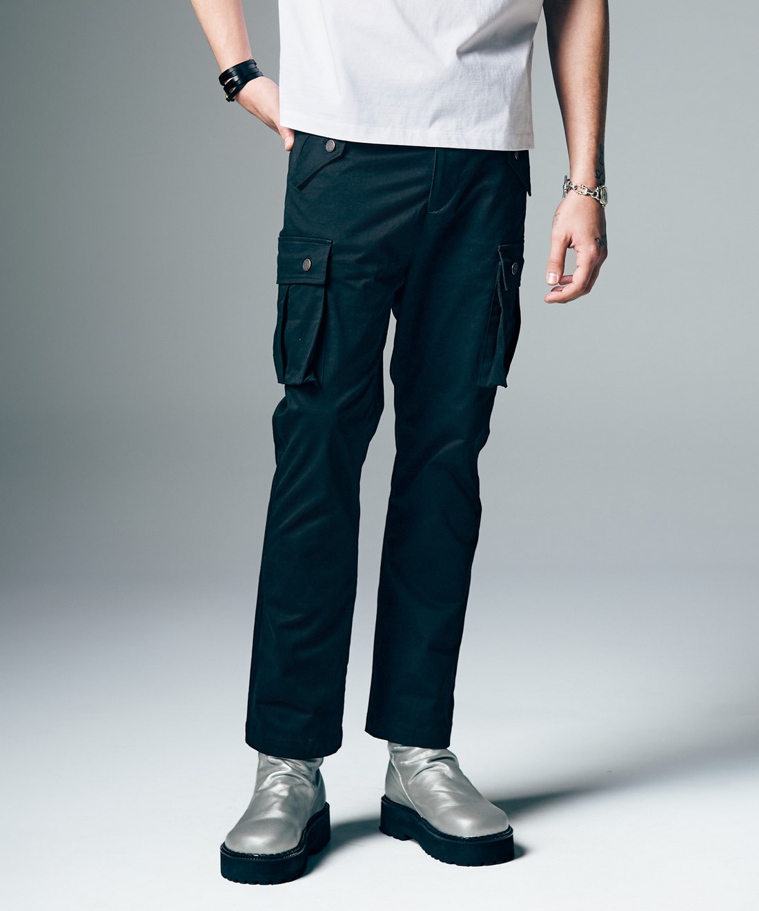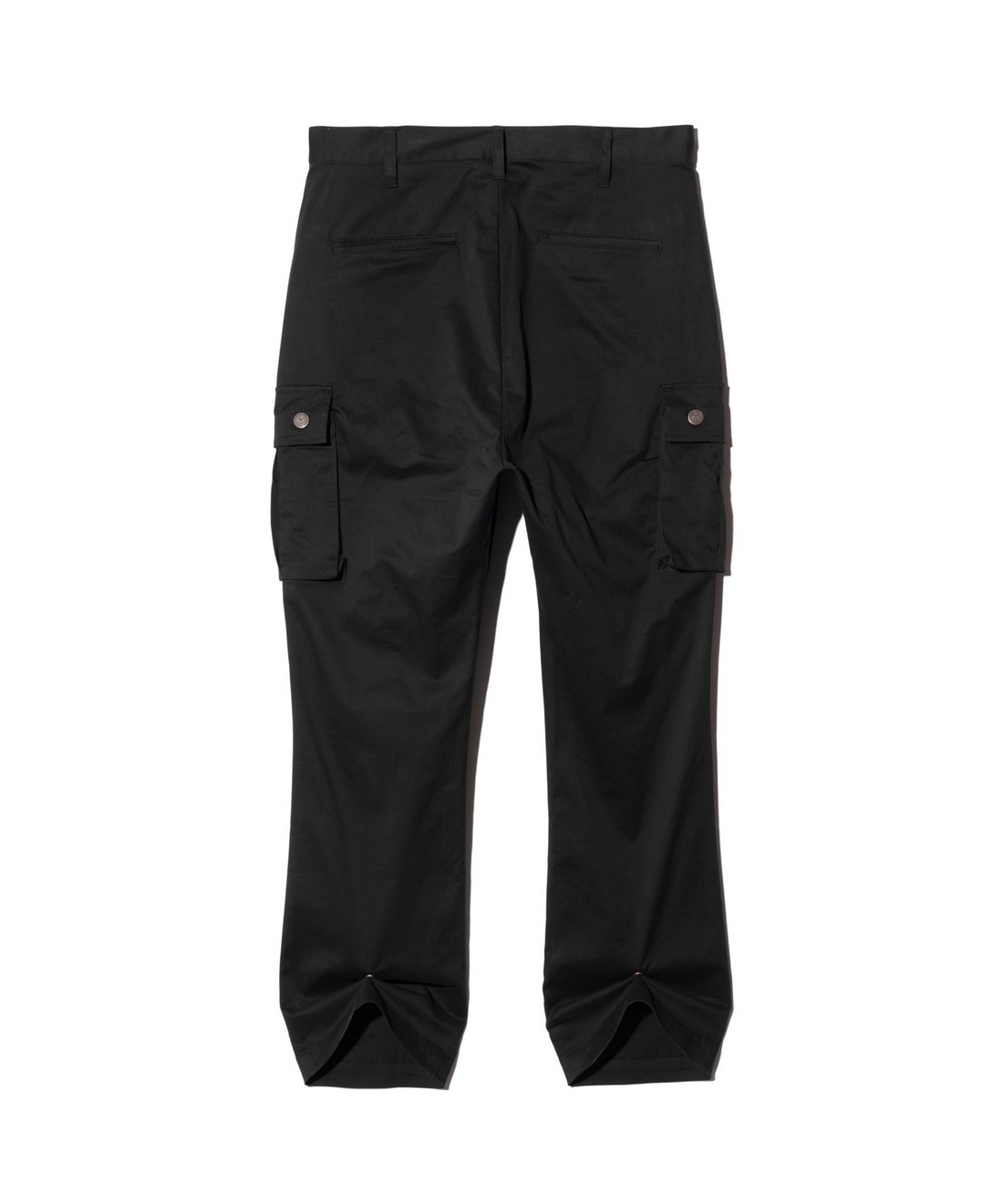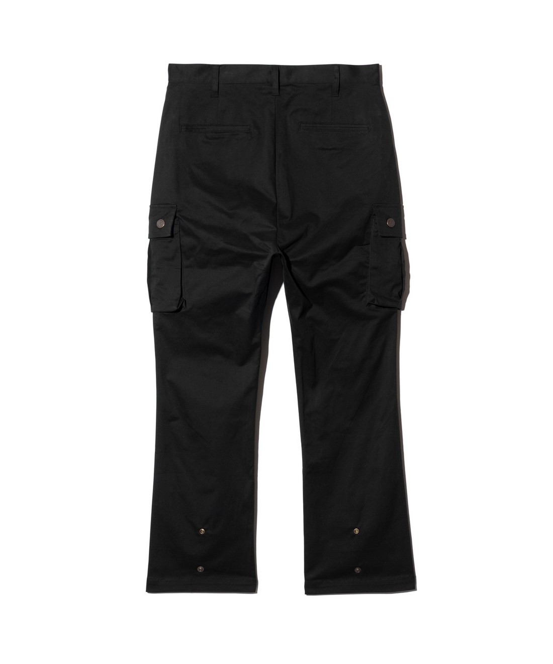 ミリタリーパンツをソリッドなシルエットに刷新、ストリートからエレガントスタイルまでカバーするSarrouel Flare Cargo Pants。タイトフィッティングのボディはサルエルライクな深めの股上と緩やかなフレアラインを組み合わせた真新しいシルエット。前身頃にはブランドオリジナルボタンを用いたフラップポケットとカーゴポケットをそれぞれ左右2箇所ずつ配してヴィンテージ調のムードを加えています。後ろ裾にはスナップボタンを備えてロールアップへのアレンジもアシスト。テキスタイルにはストレッチ混のライトウェイトチノ生地を用いており春夏らしい軽さあるは着心地にまとめています。