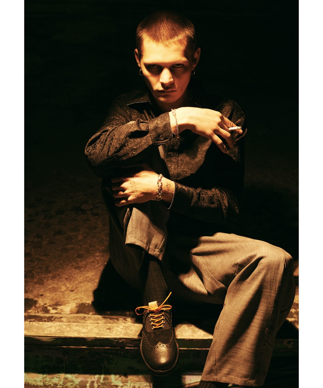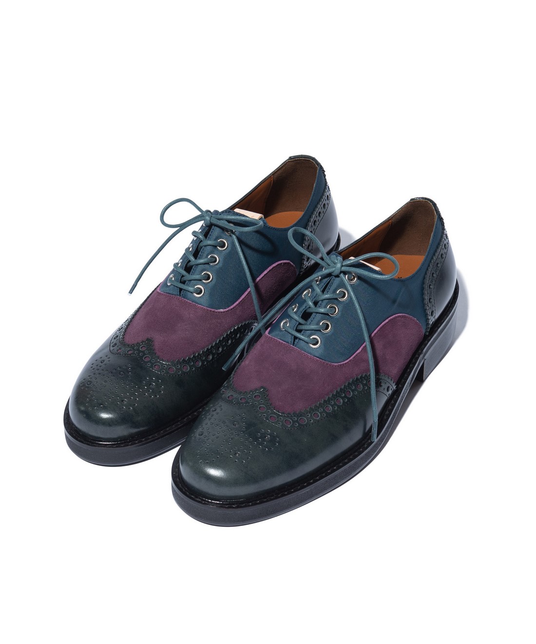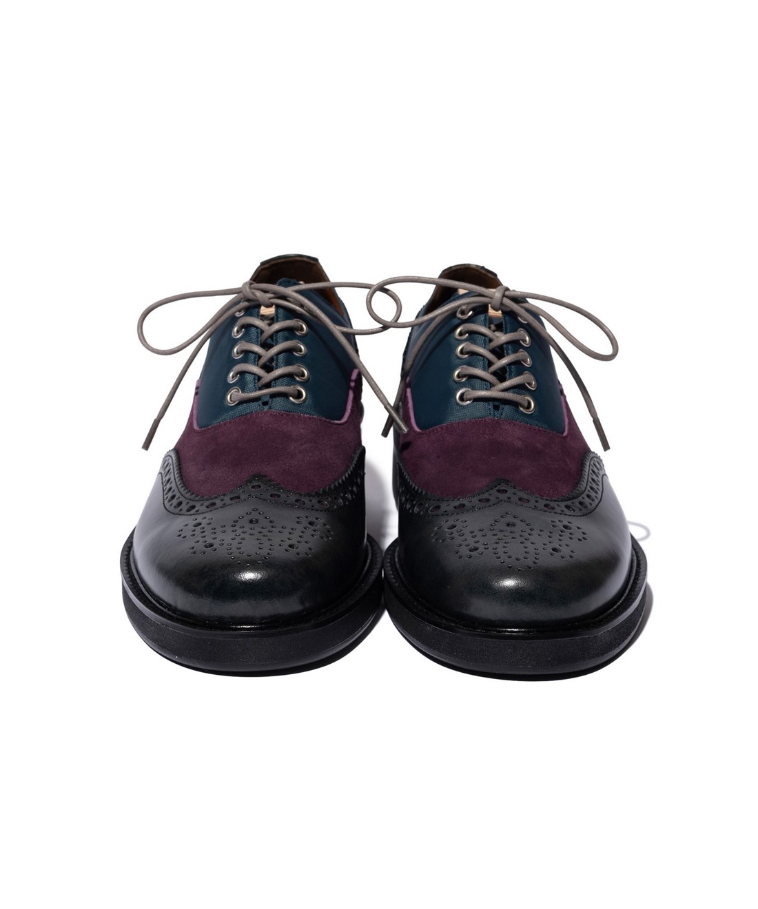 ブリティッシュトラッドを象徴するカントリーシューズを異素材ミックスでアーバンに仕立てたMixture Country Shoes。ウイングチップにメダリオンやパーフォレーションを施したトゥはカラバリごとにBlackはシュリンクレザー、BrownとNavyはガラスレザーを使用。配色のシューレースもアクセントとなっております。アッパーはスエード、羽根はアウトドアギアに用いられるナイロンオックスと巧みに使い分け、アクティブでクラフトマンシップあるルックスを作り上げました。ミッドソールにはクッション性に優れるEVA素材を使用。東京にある老舗ファクトリーにて丹念に仕上げてお届けします。