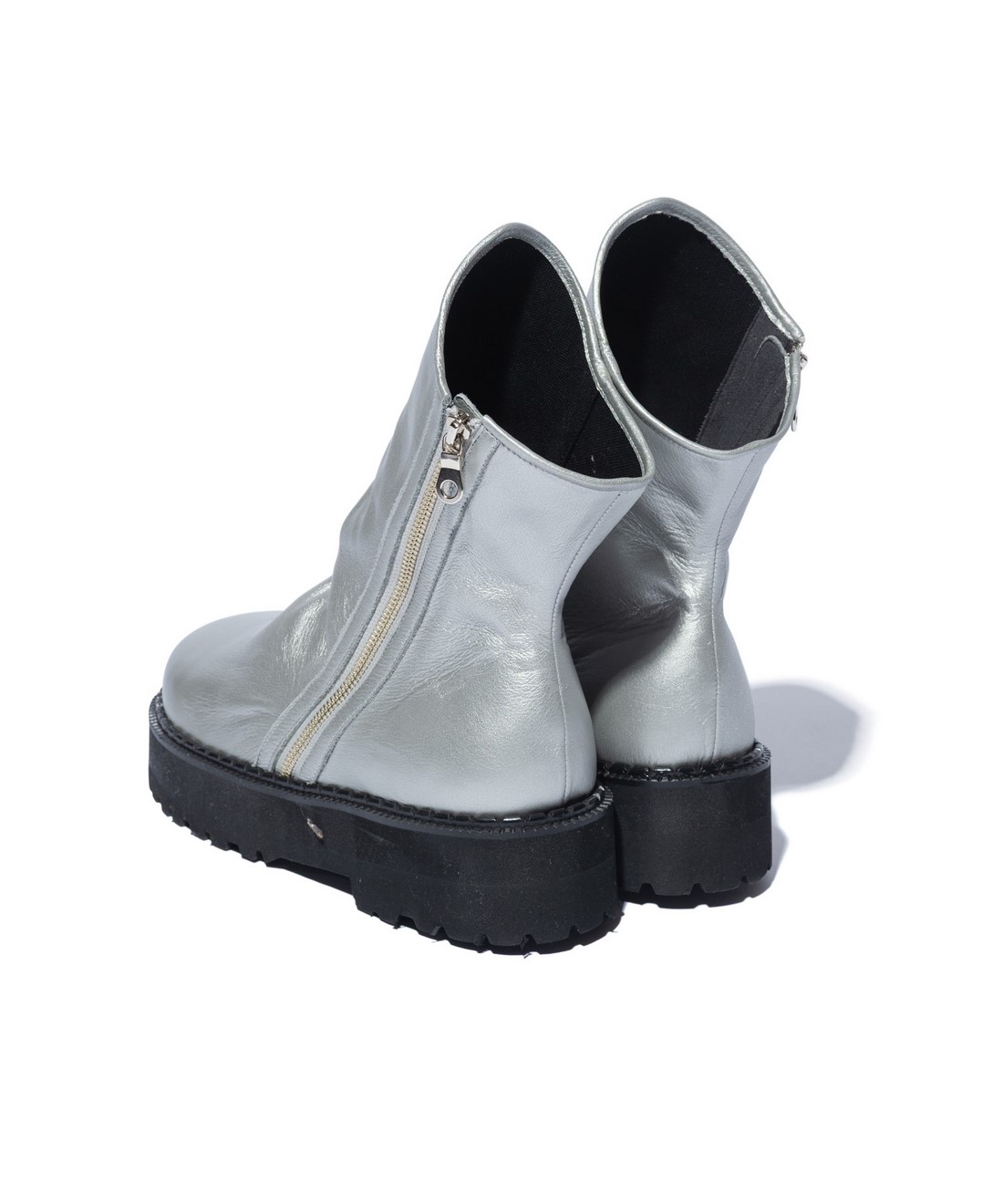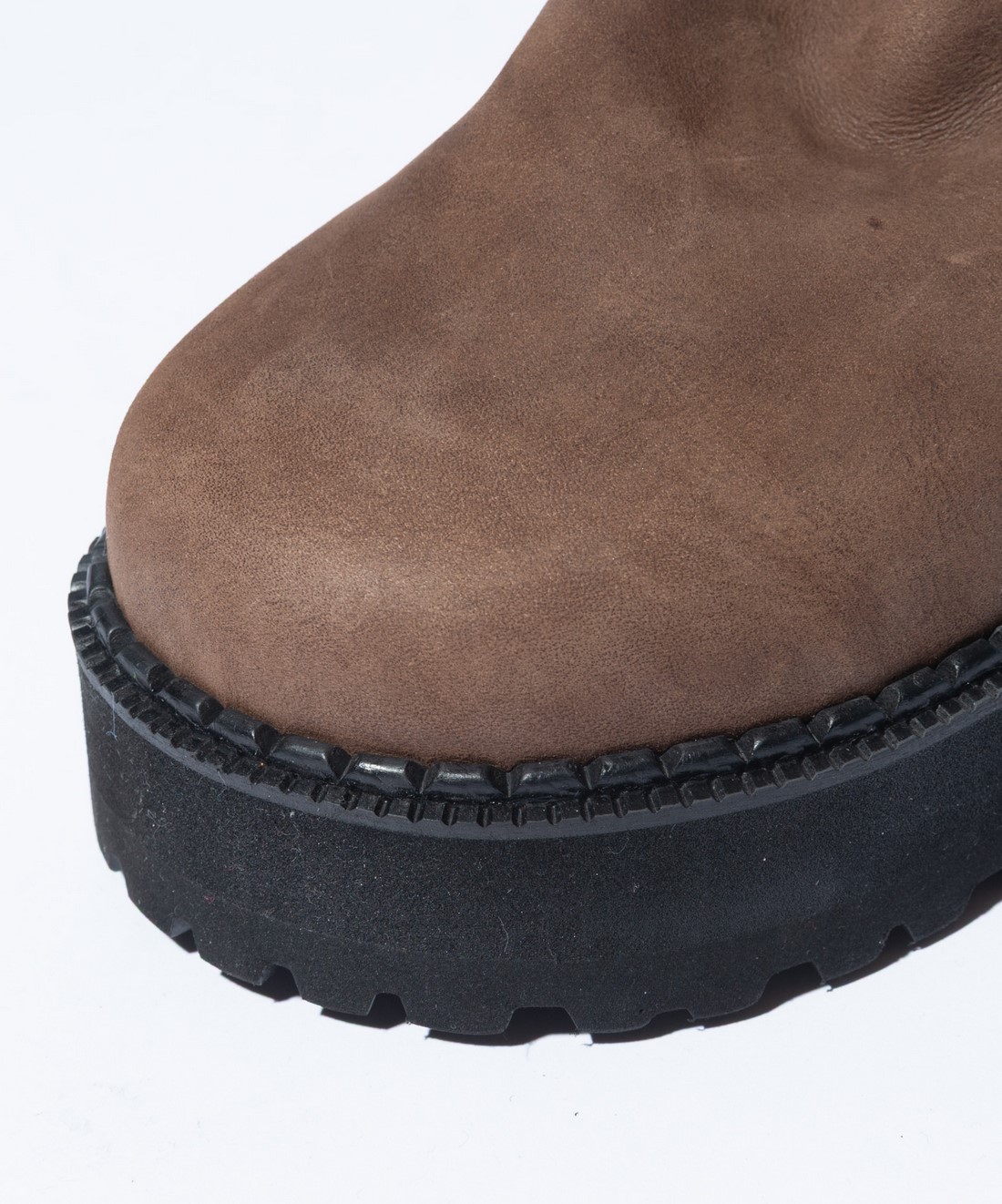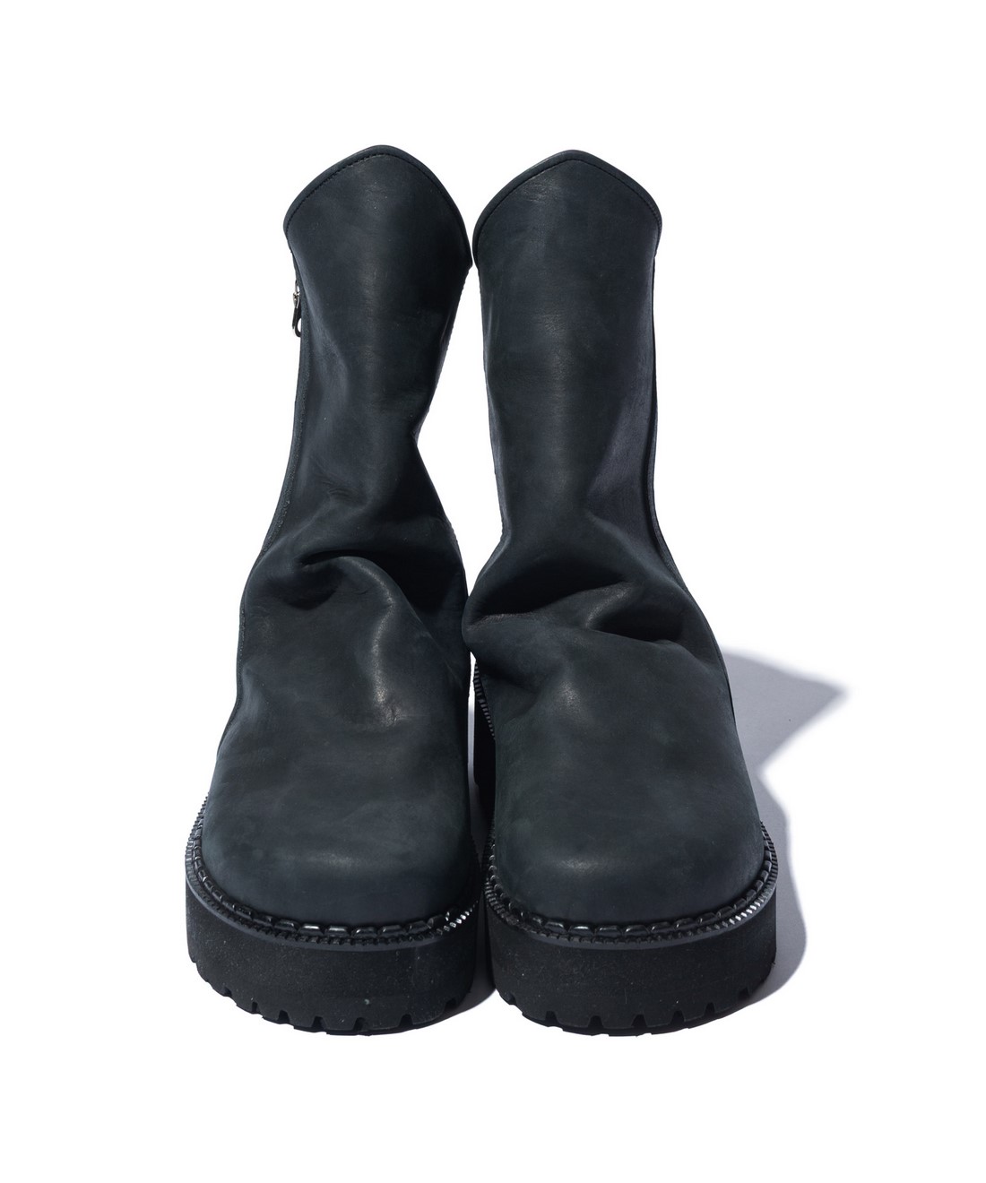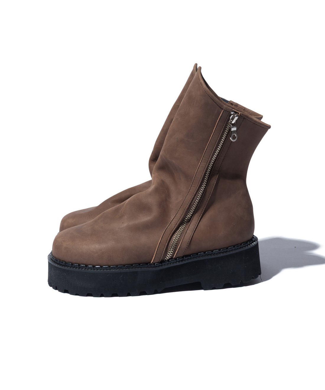 放浪者のムードを国内生産のクオリティで足元に描き出すDrape Leather Boots。斜めに傾けたアイコニックなシャフトは着用の際にドレープが生まれるよう計算したもの。ワイドに設けたトゥと無骨な押し縁がタフなムードを演出します。5cmのボリュームをもたらす厚底はクッション性あるEVAのミッドソールにタンクソールを合わせて構築。素材はBlackとBrownは経年変化を楽しませる厚口のオイルカウレザー、Silverは上質なホルスタイン原皮を柔らかに加工したドラムダイとカラーバリエーションごとに使い分けました。