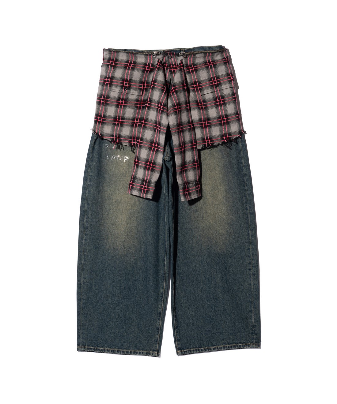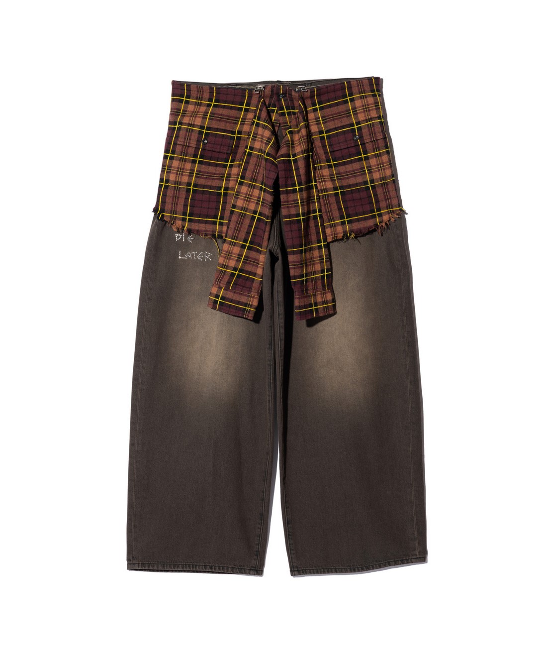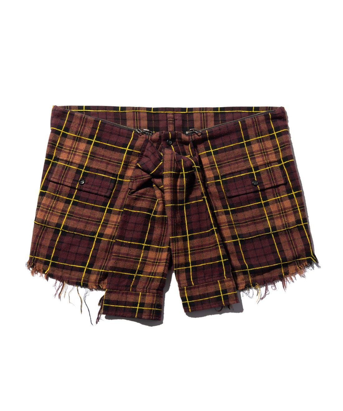 腰巻きシャツをインスピレーションに、バッグの進化系を提案するCheck Shirt Bag。ベルトループを付属したボディは左右に2つずつジップポケットとフラップポケットを備えたもの。腰に着用するのはもちろんのこと、袖に見立てたパーツを広げれば斜めがけしてショルダーバッグとしてもご使用いただけます。コットン100%のテキスタイルは手ですいた後に製品洗いをかけてダメージ加工。ハードコアながら生地段階でチェック柄に合わせてモール糸をステッチし、ギャップあるアクセントを付けています。