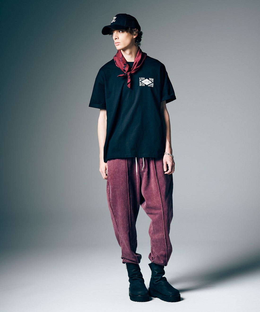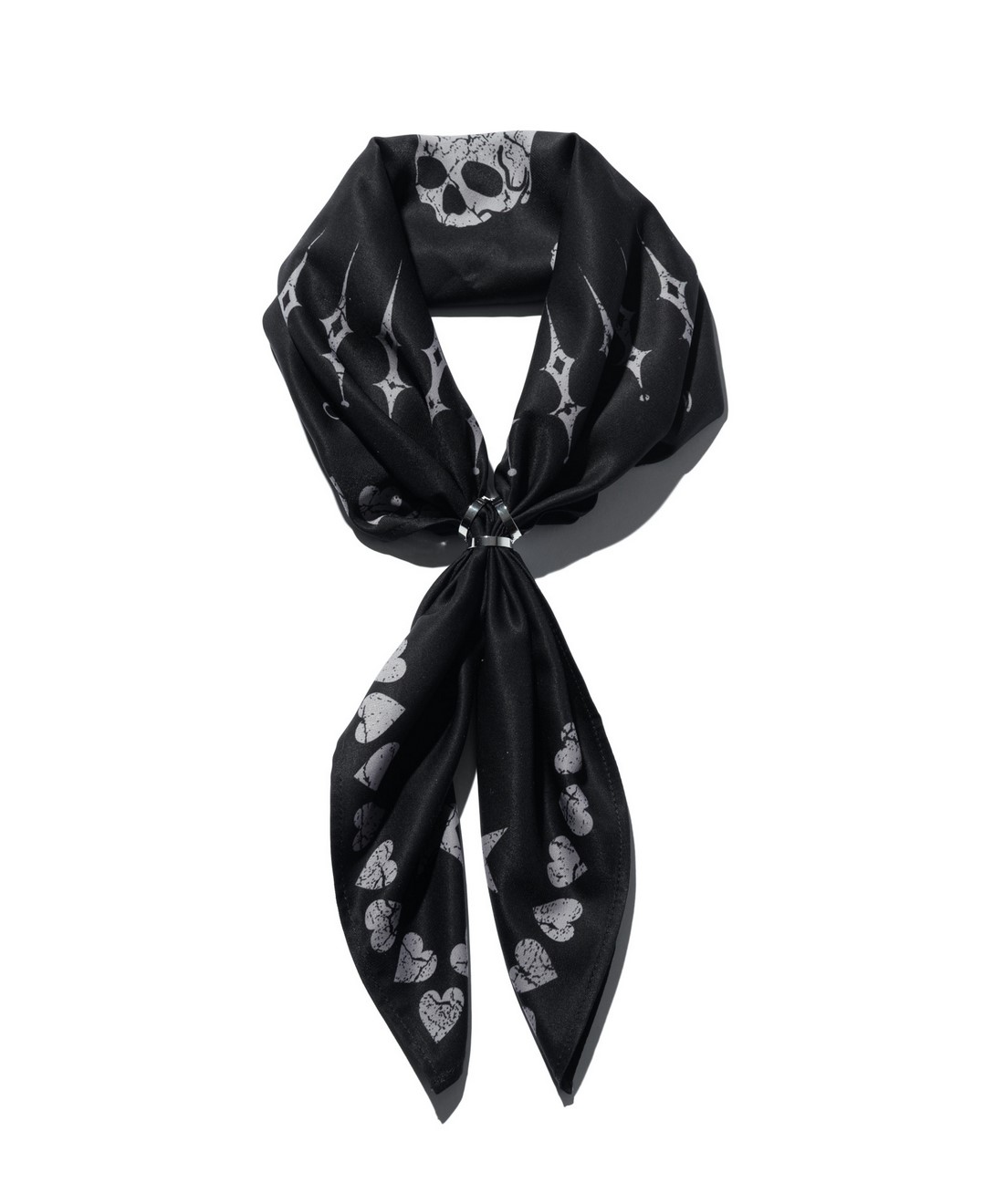 グランジ的なモチーフをスカーフに散りばめたSkull Heart Bandana。クラックの効果を持たせたハードな柄使いをプリントしながら、シンメトリックに配置することでモードストリートな一枚に。ロックテイストあるバンダナ使いの他、穴に通すだけでまとまるリングを付属しておりスカーフとして品良くまとめる着用もお楽しみいただけます。