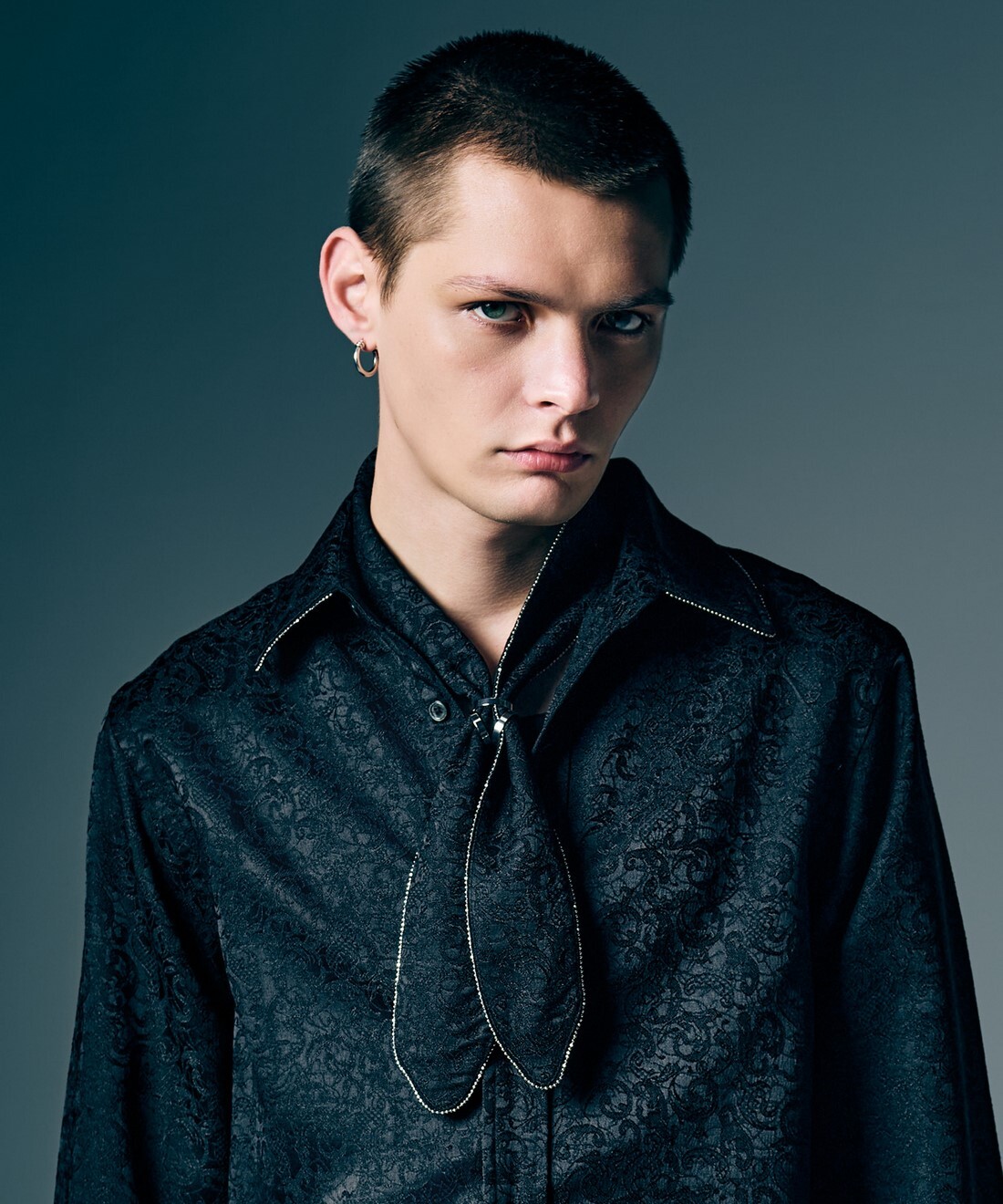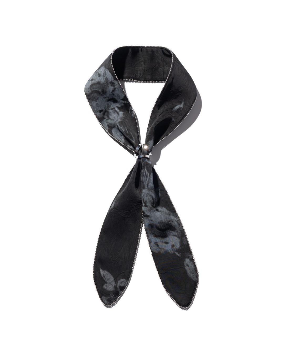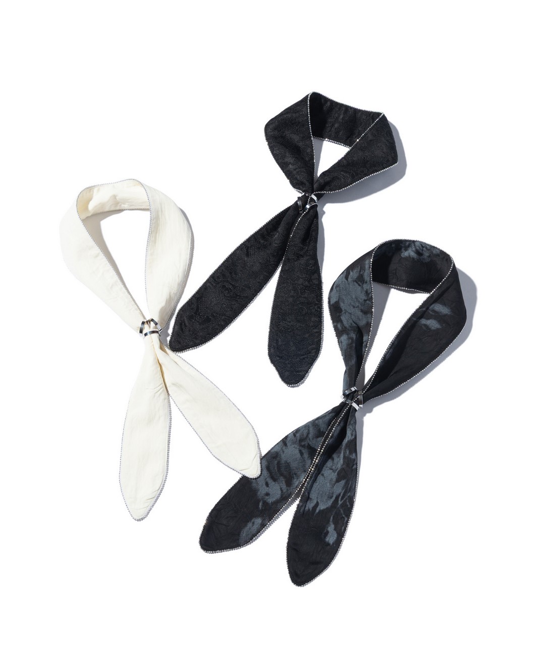 サマーコーディネートのワンアクセントとしてスカーフをロックスタイルにアレンジしたStuds Line Scarf。縁にはスタッズテープを挟み込み煌びやかに装飾。アレンジを手軽にバランス良くまとめるリングも付属となります。カラーバリエーションごとに異なるテキスタイル使いも本作の特徴。Whiteは無地のレーヨンコットン、Black×PaisleyとBlack×Flowerはそれぞれ総柄生地を用いており、お好みの1本を探していただけます。