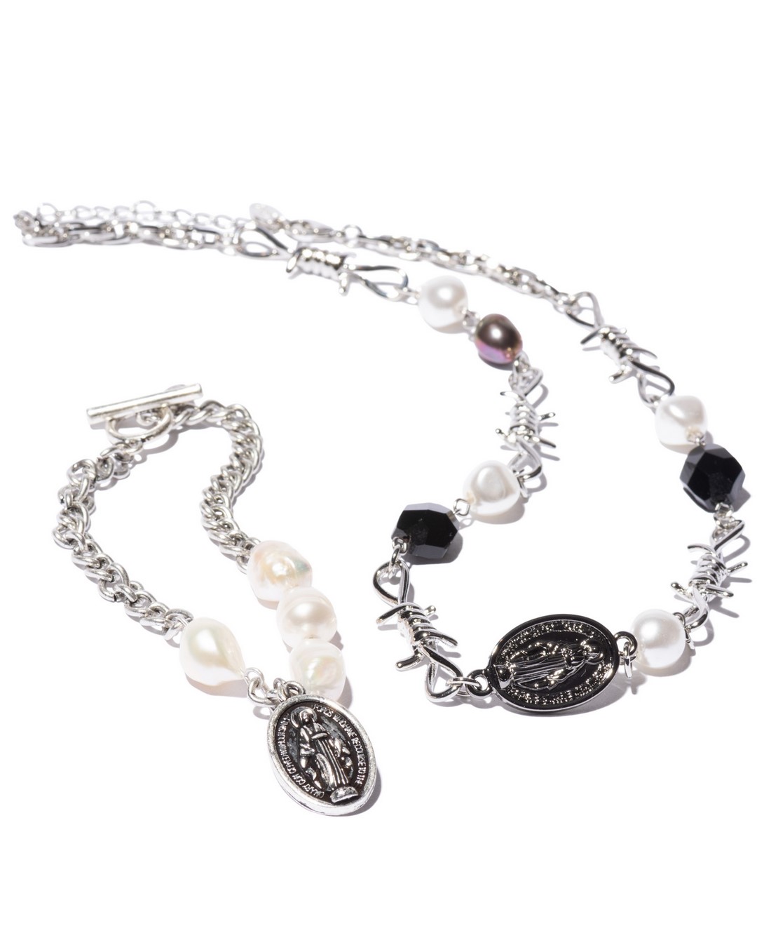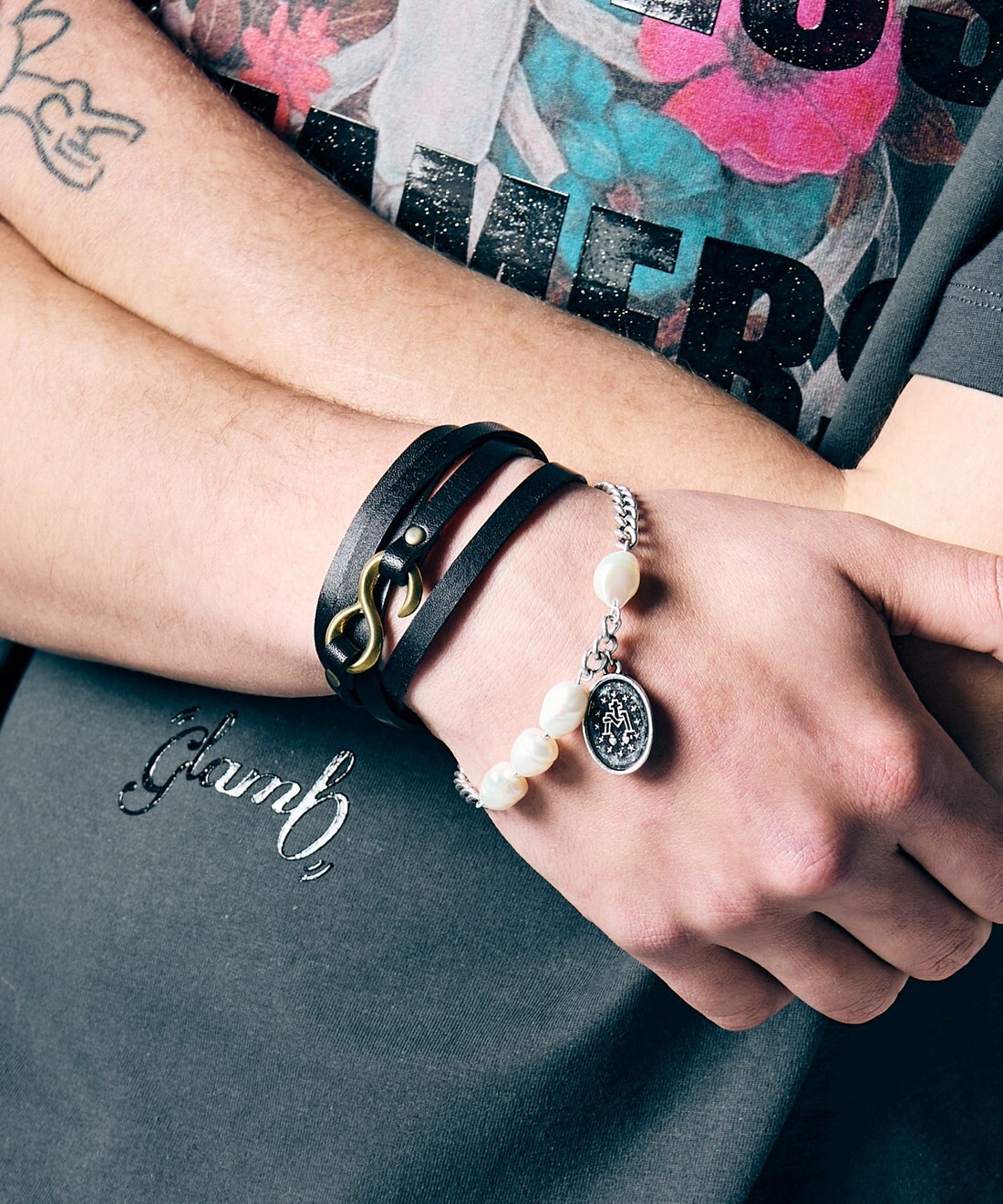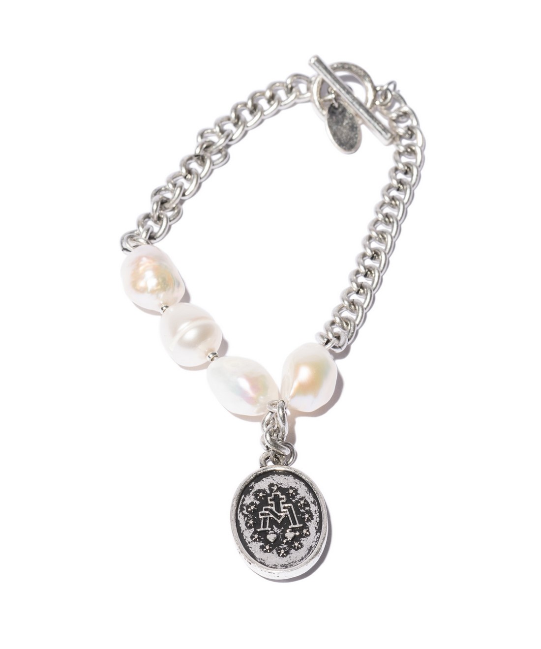 上品なチェーン使いにミステリアスなエッセンスを添えるMaria Pearl Bracelet。手元を彩るのは等級の高い淡水パールとチェーンとのエレガントなコントラスト。チャームとしてマリアコインのチャームを配して神秘的なムードを加えました。