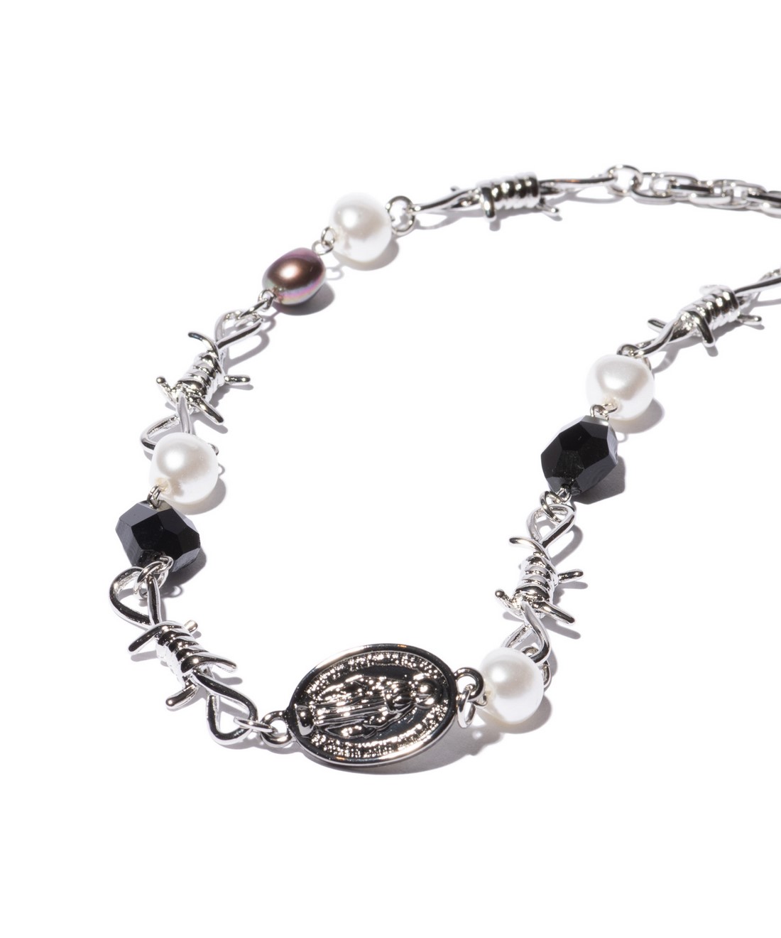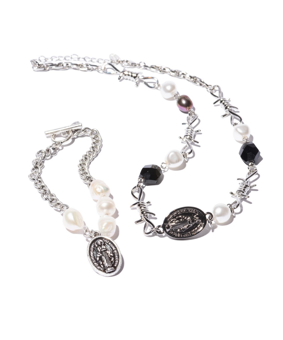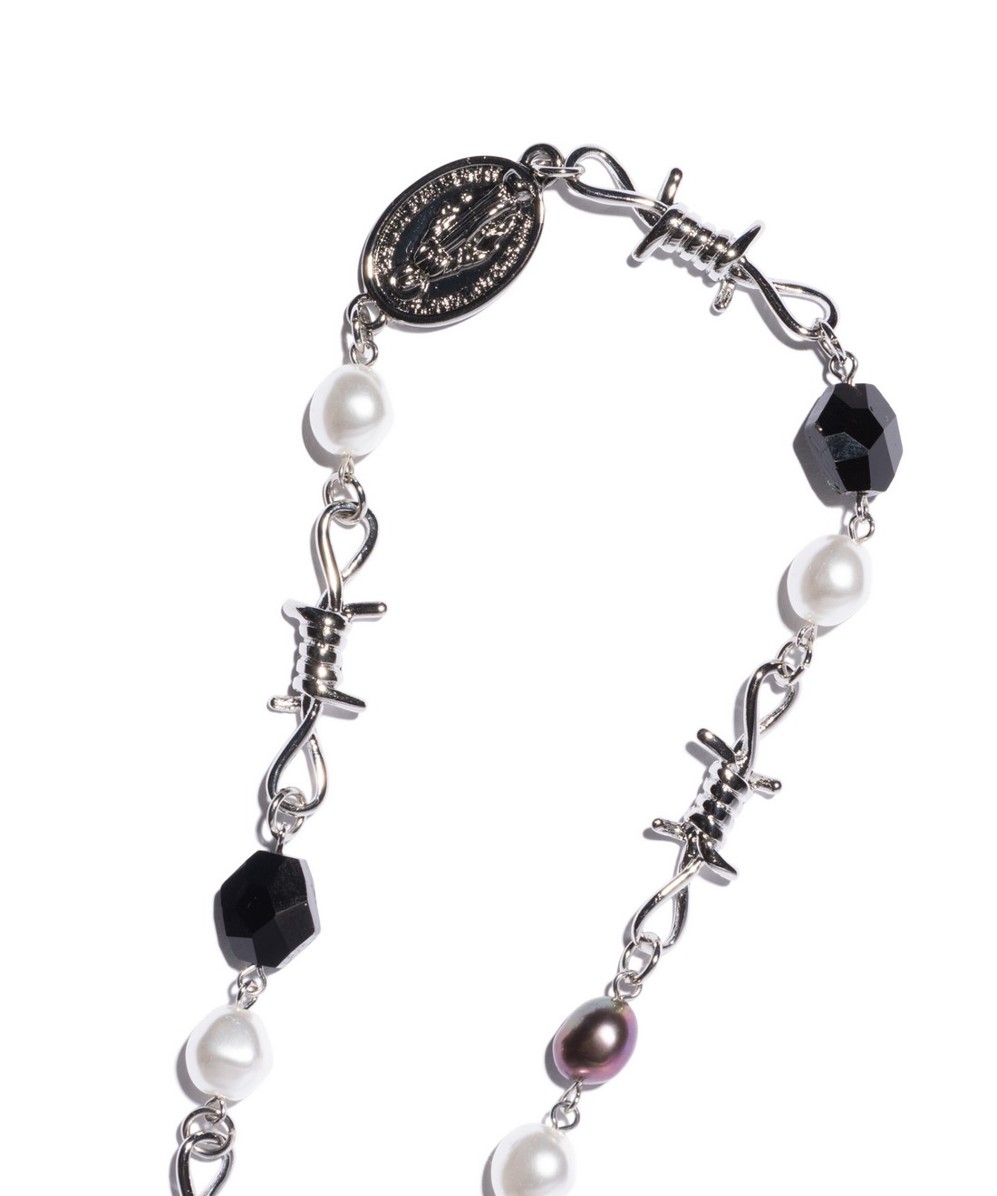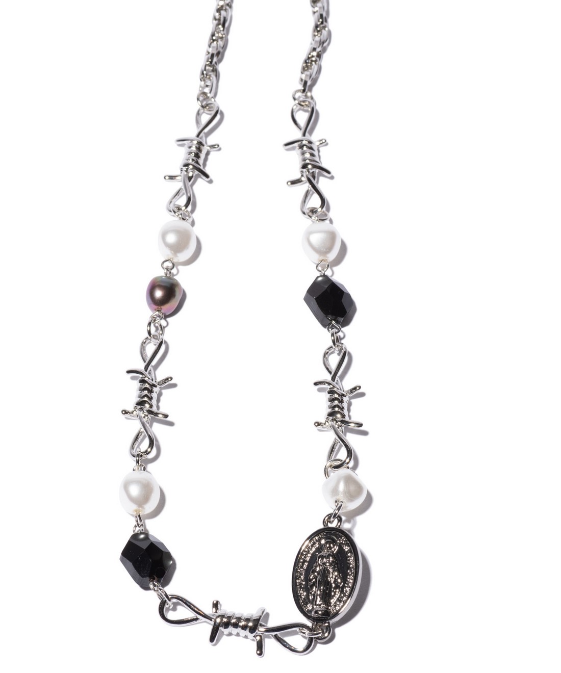 パンクスタイルの中にエレガントなモチーフを散りばめてコントラストあるヴィジュアルを生み出すAnarchy Pearl Necklace。有刺鉄線を用いたチェーンをメインに、淡水ブラックパールやバロックパール、カットガラスをミックス。チャームにはマリアコインをあしらい、清濁を合わせたヴィジュアルにまとめています。