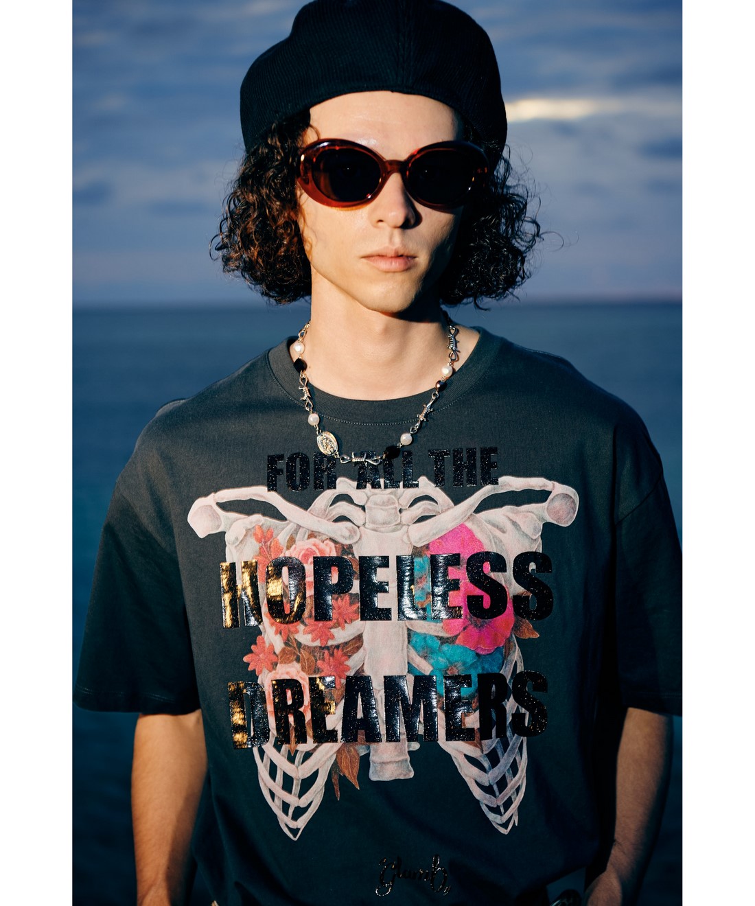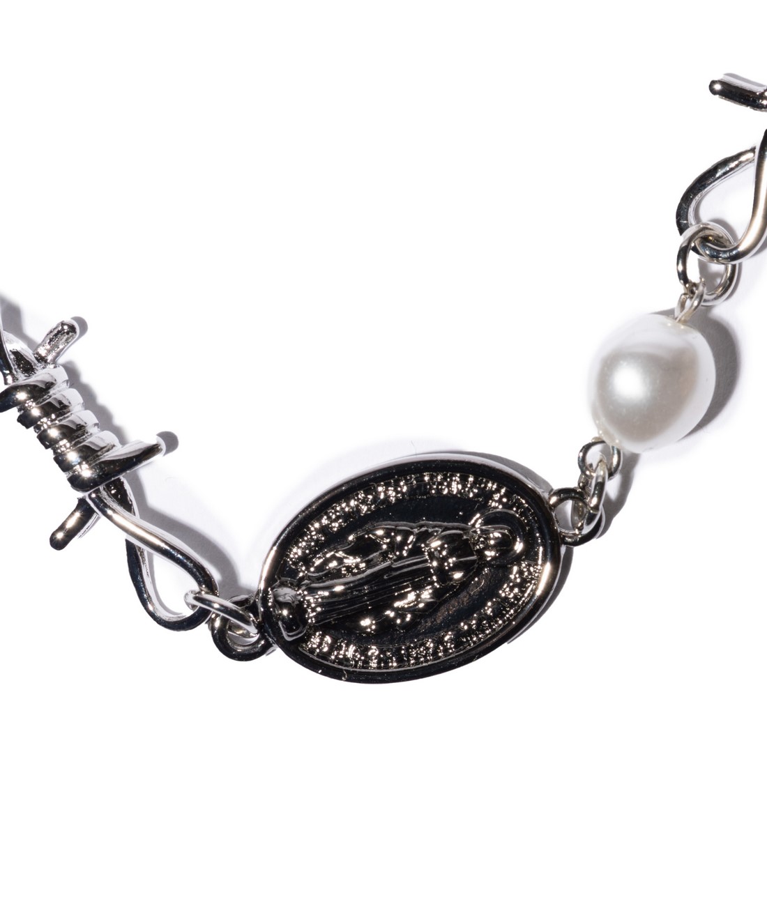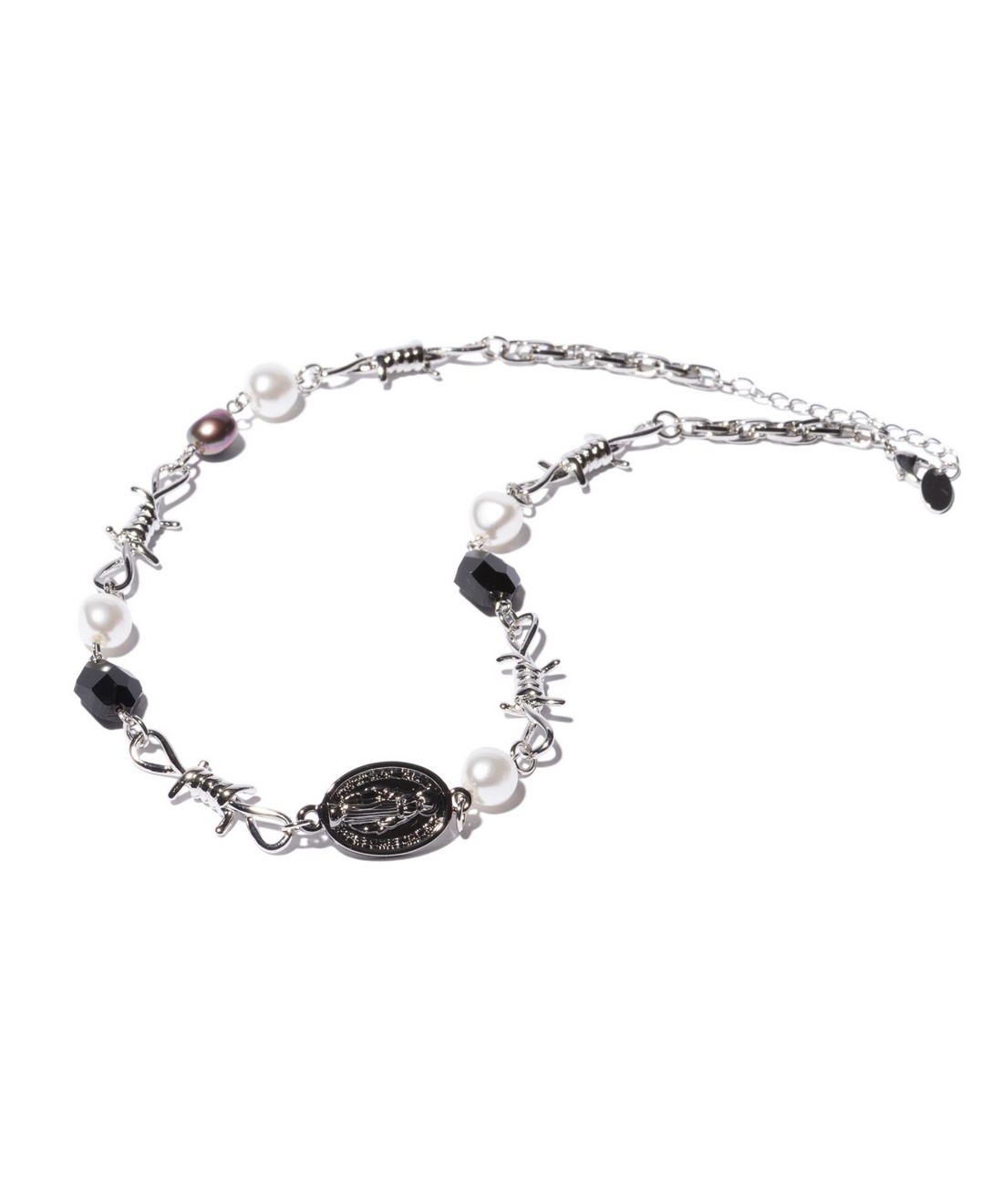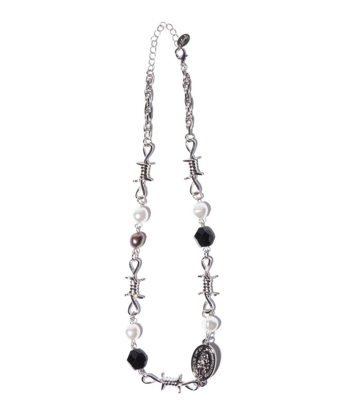 パンクスタイルの中にエレガントなモチーフを散りばめてコントラストあるヴィジュアルを生み出すAnarchy Pearl Necklace。有刺鉄線を用いたチェーンをメインに、淡水ブラックパールやバロックパール、カットガラスをミックス。チャームにはマリアコインをあしらい、清濁を合わせたヴィジュアルにまとめています。
