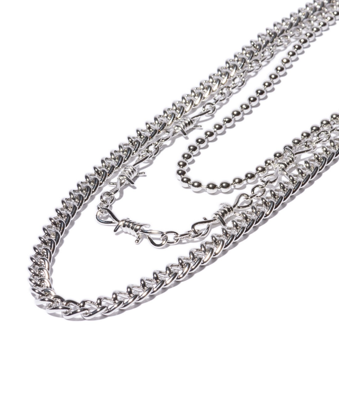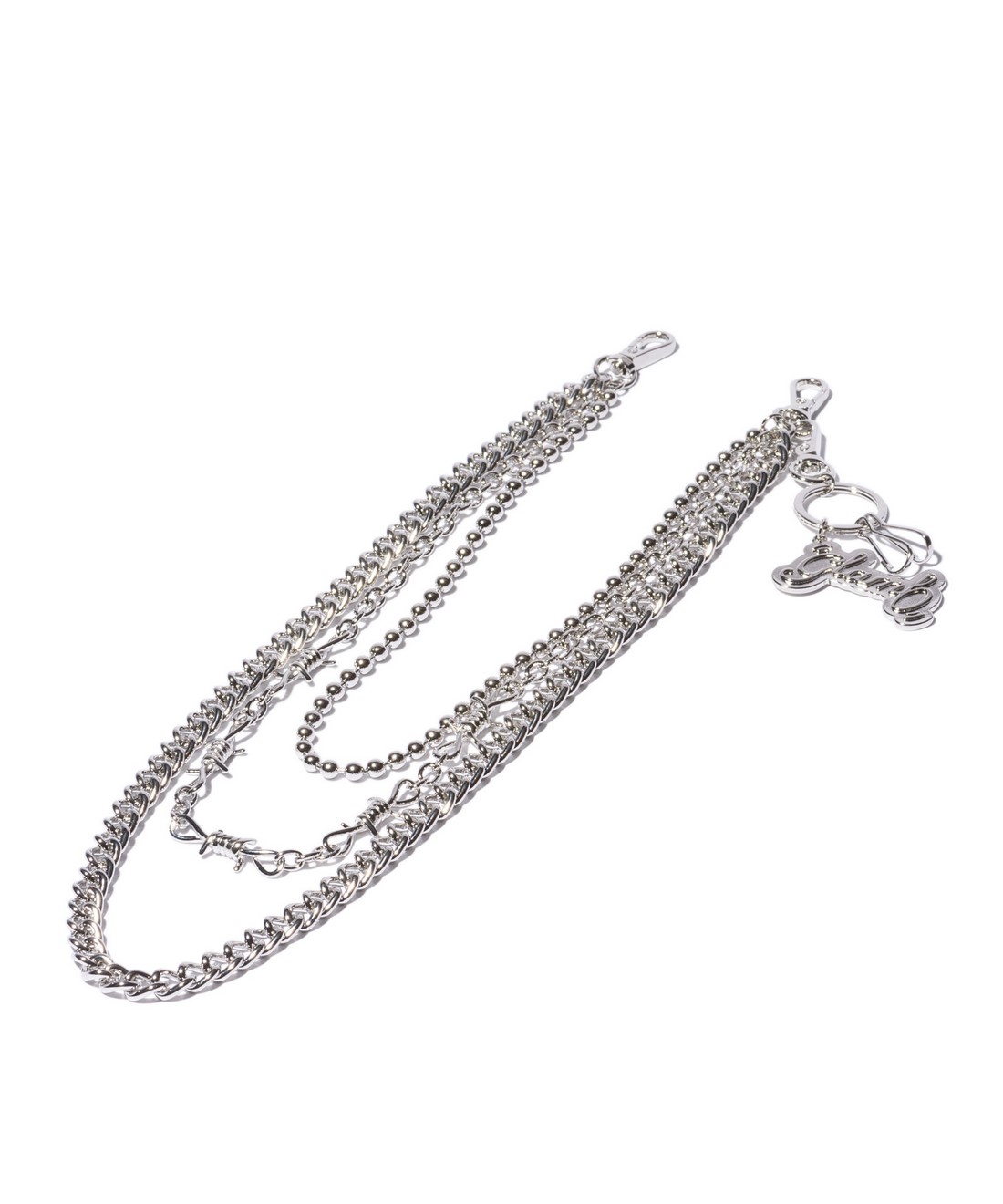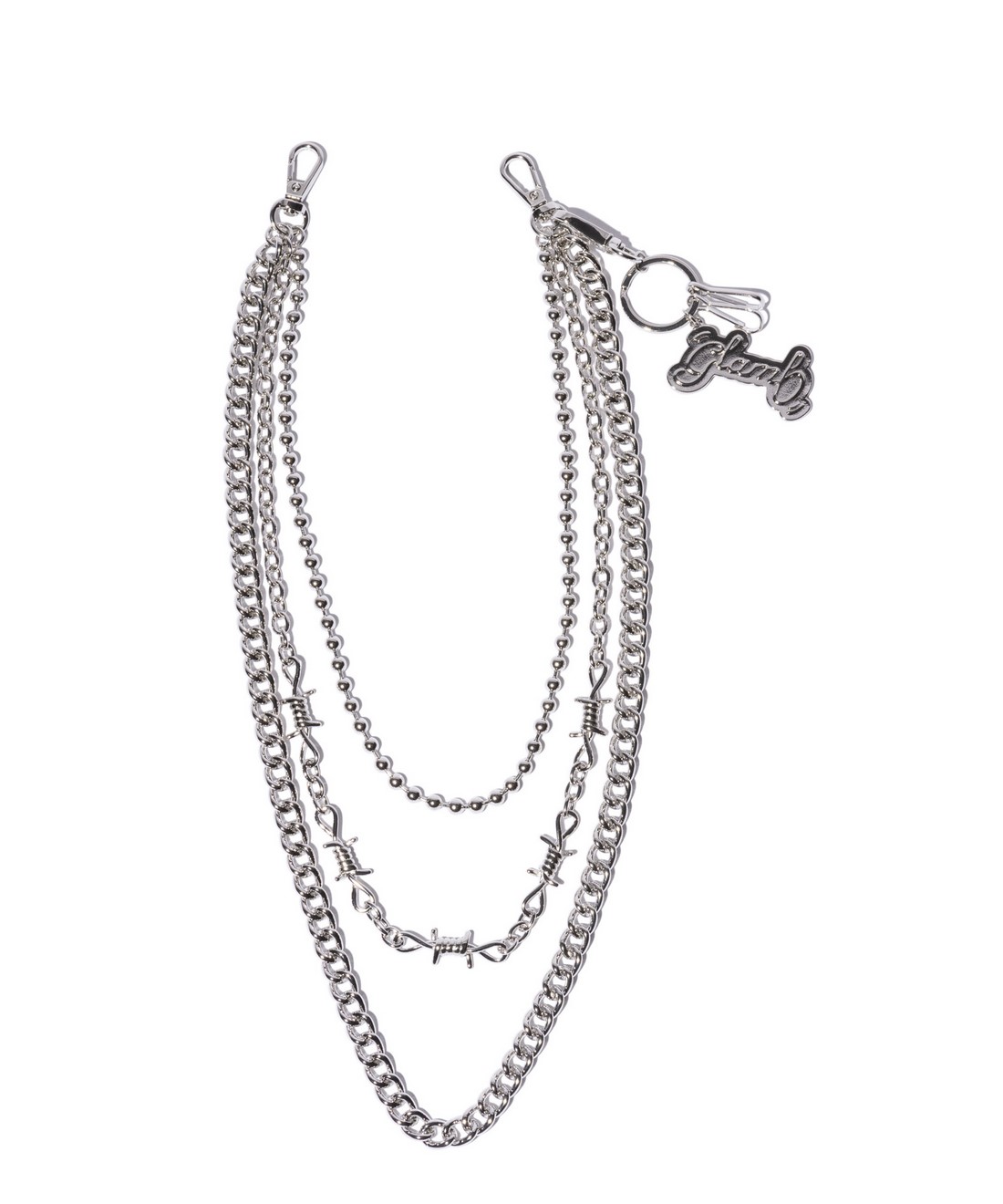 3種の異なるチェーンをひとまとめにし重厚なルックと機能性を持たせたTriple Layer Wallet Chain。パンキッシュな有刺鉄線モチーフ、ボールチェーン、リングチェーンは一手で奥行きあるアクセレイヤードを完成。ロゴチャームパーツは取り外しが可能でとなり単体でキーホルダーとしてもご使用いただけます。