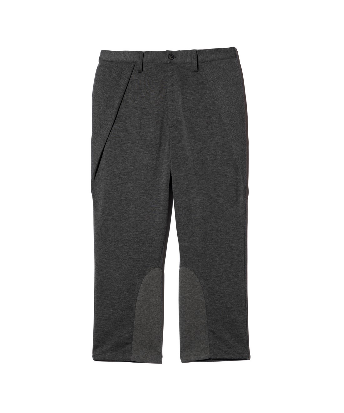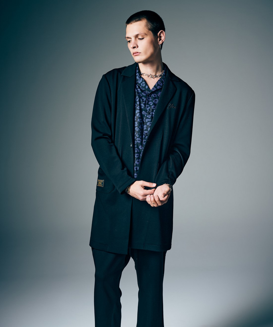 トラッドなコートシルエットを軽やかな素材使いとともにセットアップスタイルでストリートに提案するChesterfield Shirt Set Up。トップスは襟にノッチドラペル、バックスタイルにセンターベントをあしらったチェスターコートを思わせるロングシルエット。そこにスポーティなジャージ生地をあしらうことでイージーなムードへとカジュアルダウン。腰元のポケットもカジュアルなムードのアウトポケットで配し、フォーマルに傾き過ぎないルーズなムードにまとめています。同生地を使用したボトムスはクロップド丈のテーパードシルエット、股下にパネル使いでマチを設けたアクティブな立体仕立てとなっています。そこに腰元から膝脇にかかる特大のタックや裾半身のリブ切り替えをあしらって、ミニマルなルックスの中にアーバンなアヴァンギャルド性を潜ませました。