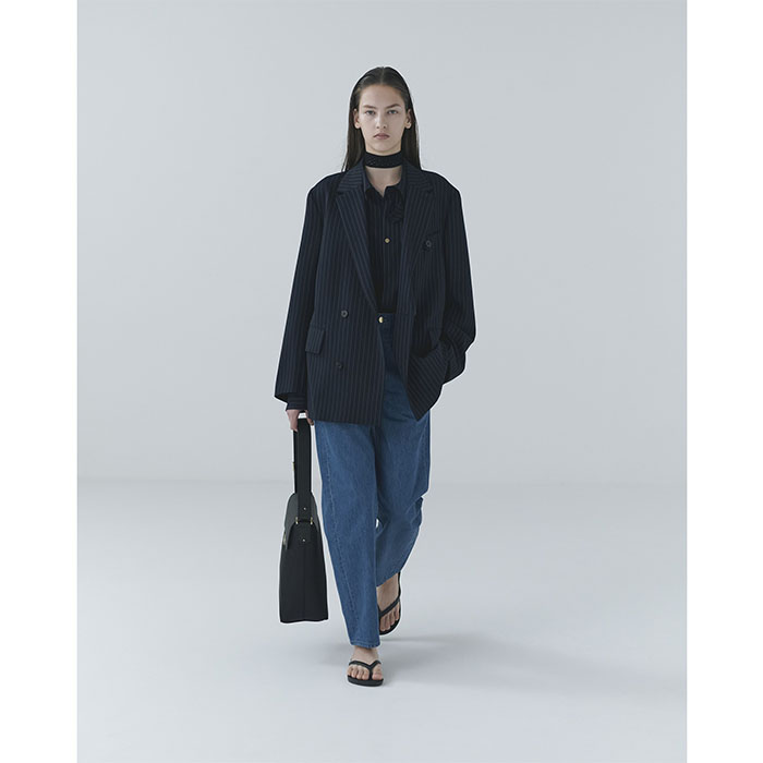 美しいドレープと上品な質感のストライプのダブルクロス素材を使用したテーラードジャケット。