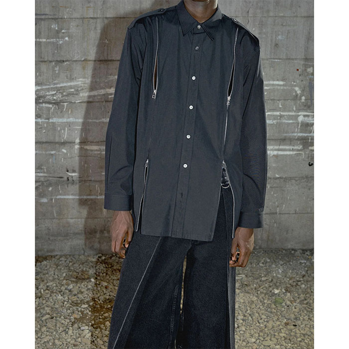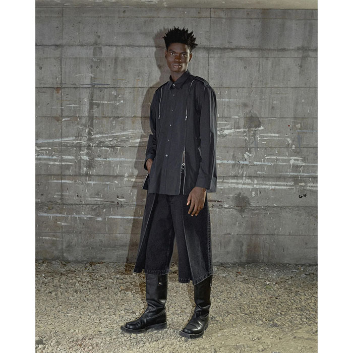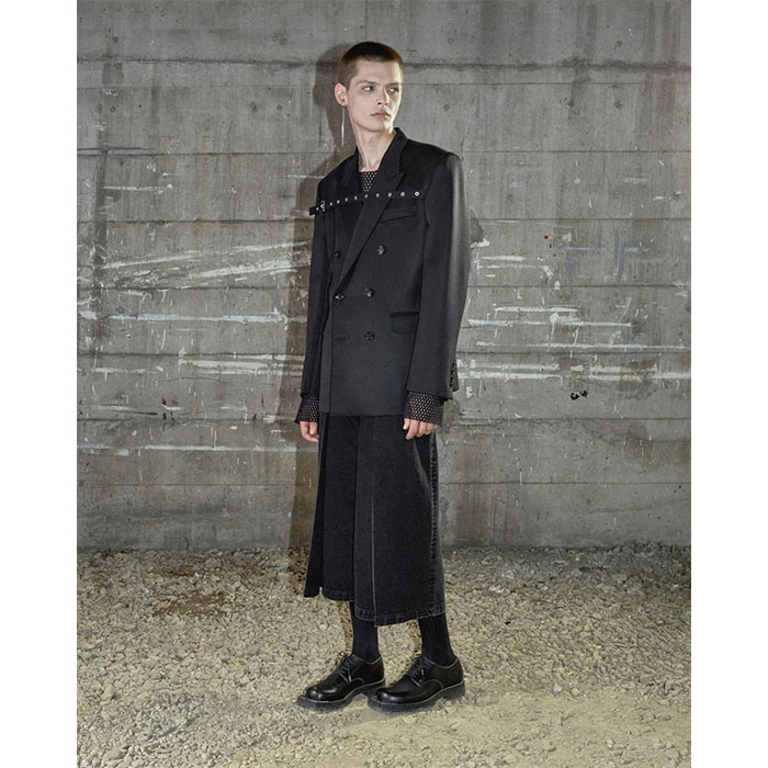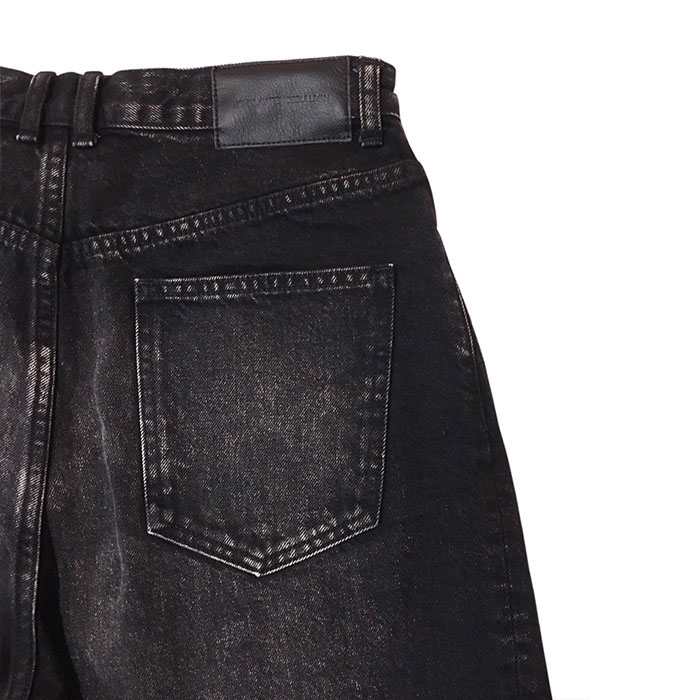 クラシックな5ポケットディテールをベースに、前身頃へ分量を集約した独特のフォルムを形成しています。