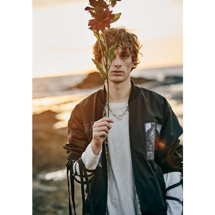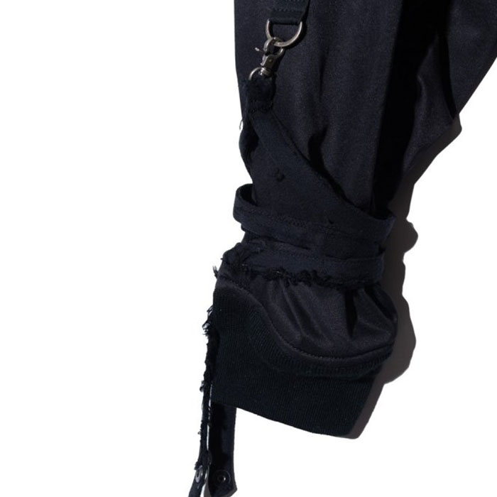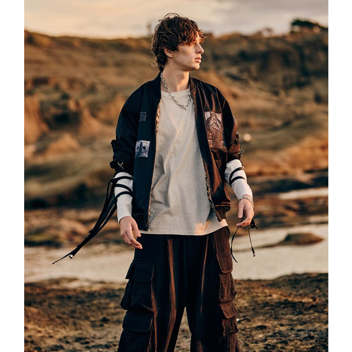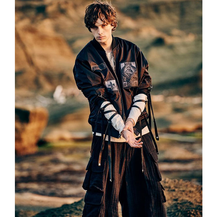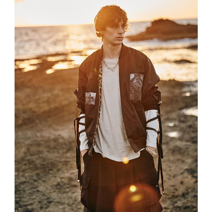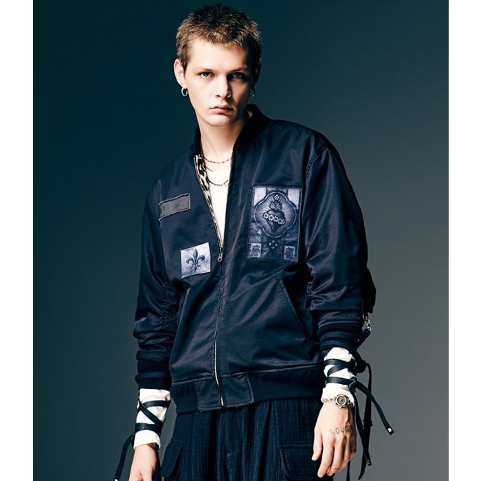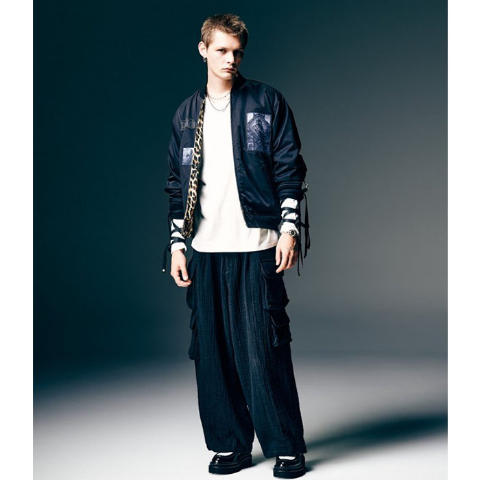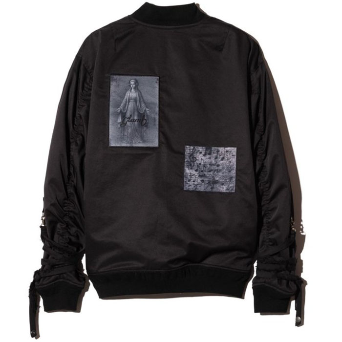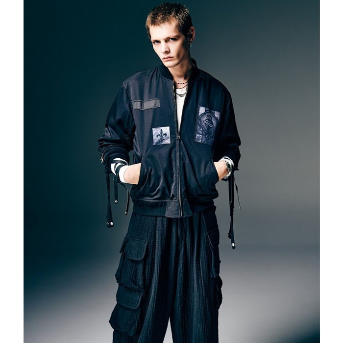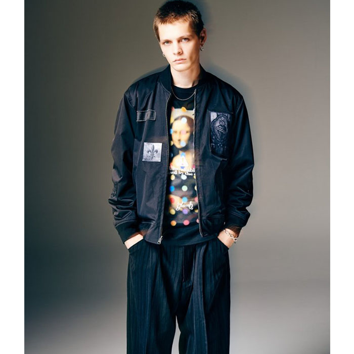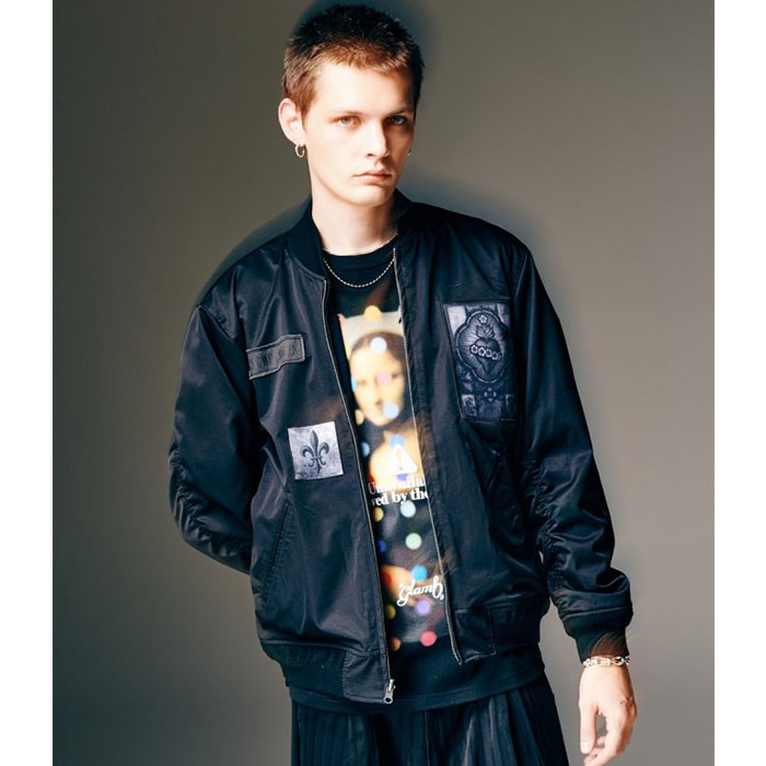 “Shadow of the Wind”をコレクションテーマに掲げた今季のglambのリリカルな世界観をミリタリーウェアに掛け合わせたBlow Reversible Bomber Jacket。ワイドシルエットのボディは宗教画や紋章の当て布を身頃の前後にパッチ。柄の中には音楽にまつわるモチーフをさりげなく隠し込んだglambらしいグラフィックワークが発揮されています。そこにあしらわれた今季のシーズンディテールが左右の袖口のDカンに繋がれるロングテープ。袖口に巻き付けたボンデージ的なアレンジもブランドからの提案です。逆面には異なるテキスタイルを使用。ボディはリバーシブルとなっており、袖口のDカンも両面に用意。ボディの2WAYとロングテープのアレンジを掛け合わせ、幅広いスタイリングを形作ることのできる1着となっております。