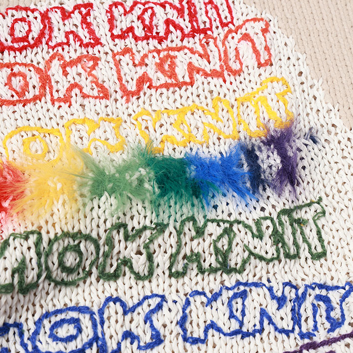糸はベースには肌触りの良いコットン糸でモチーフの糸はリサイクルポリエステルの強撚糸を使い光沢感を持たせました。