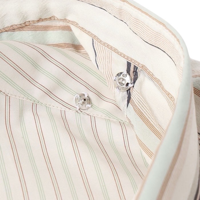 下側には120/2ジルワンダー生地に加工を施し、ハリと光沢のあるストライプ生地のレギュラーカラーシャツに仕上げました。