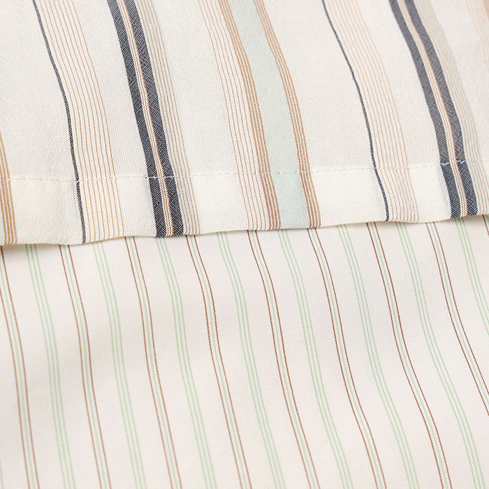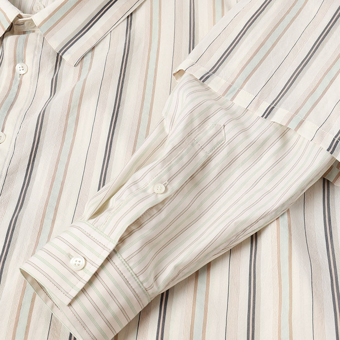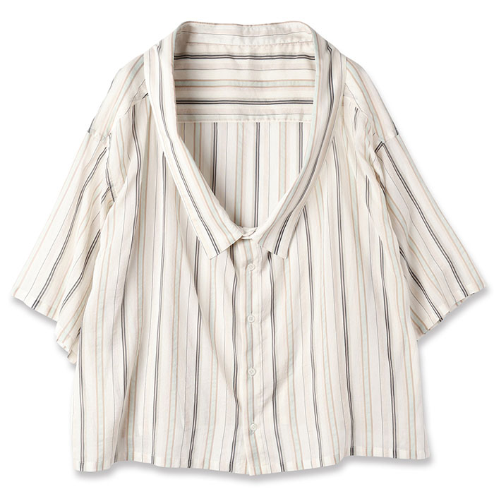 上側にはコットンリンターを原料としたキュプラと強撚糸を使用して、ドライな肌触りのあるマルチストライプ生地をベースに、シルエットはざっくりと開いた前下がりはレイヤーとして、どのアイテムにも合う様に設計されたデザインとなります。