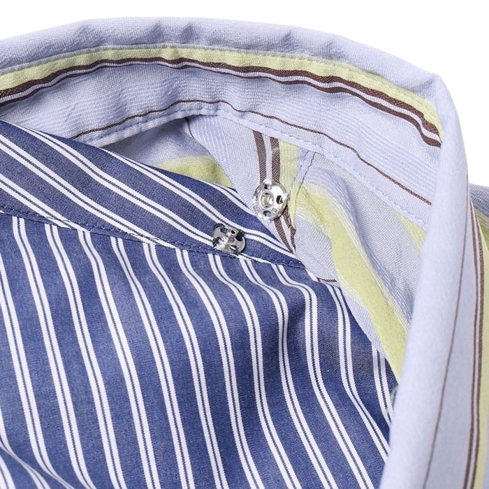 下側には120/2ジルワンダー生地に加工を施し、ハリと光沢のあるストライプ生地のレギュラーカラーシャツに仕上げました。