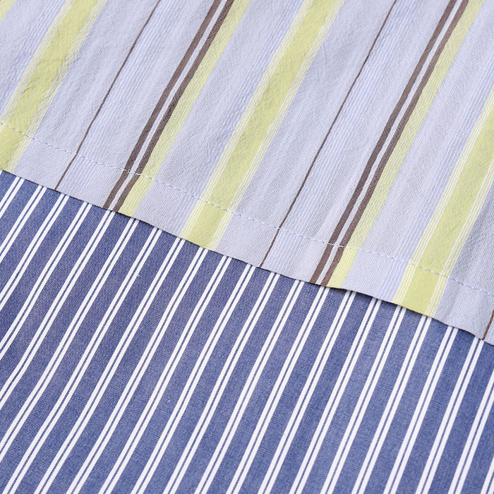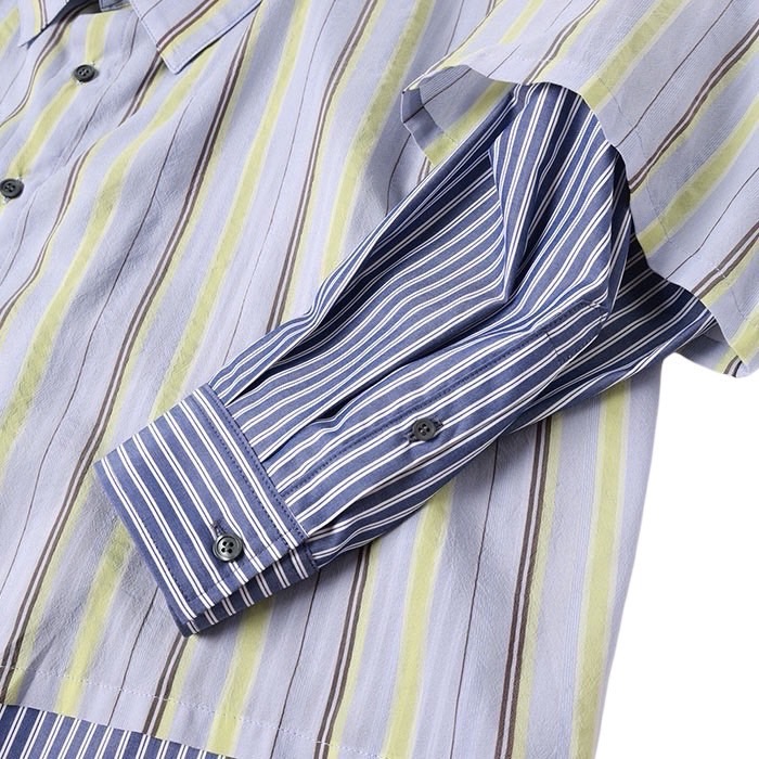 上側にはコットンリンターを原料としたキュプラと強撚糸を使用して、ドライな肌触りのあるマルチストライプ生地をベースに、シルエットはざっくりと開いた前下がりはレイヤーとして、どのアイテムにも合う様に設計されたデザインとなります。
