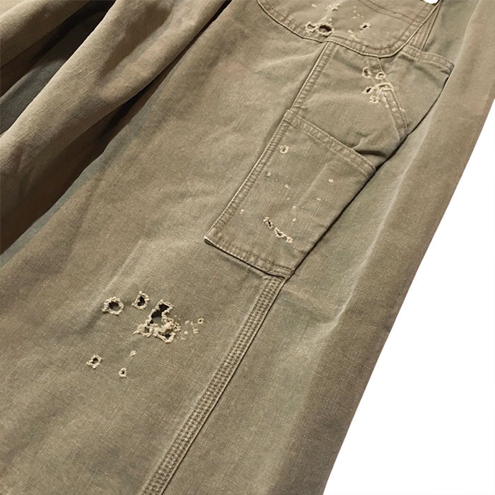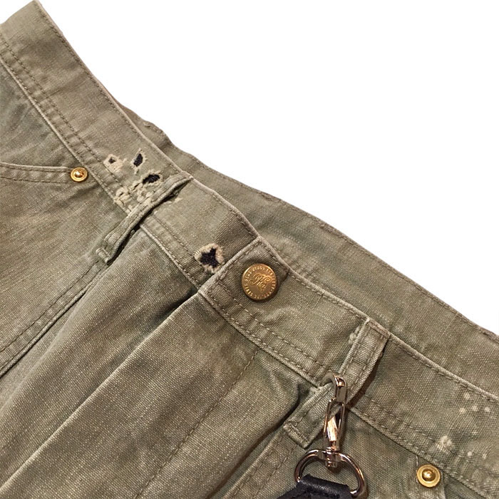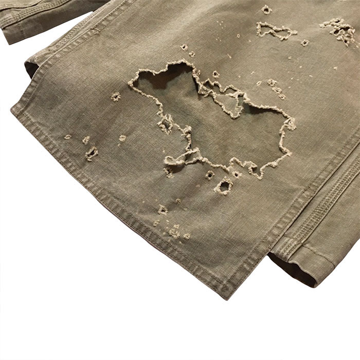 全体的にハードなウォッシュを与え、部分部分に手作業でダメージを加えました。