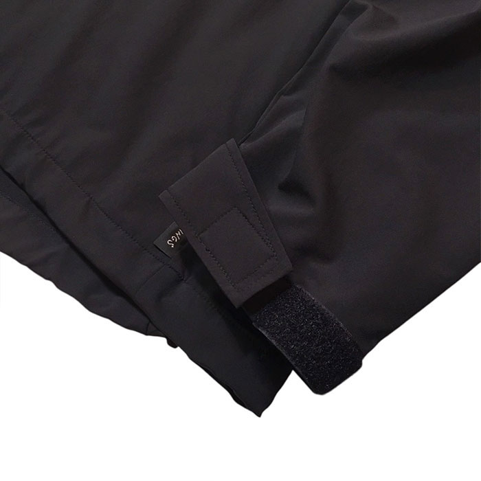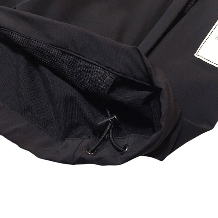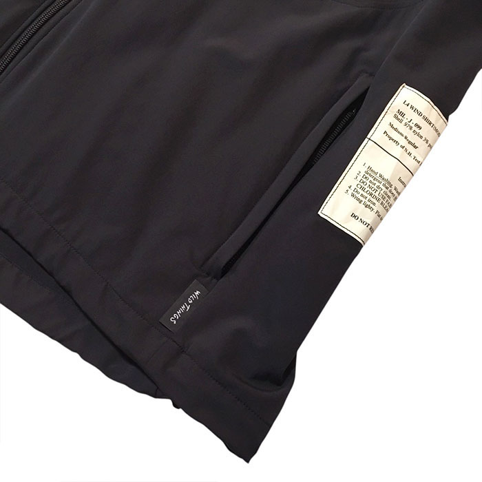 ・胸ポケットに収納可能なパッカブル仕様。スリーブは脇まで一枚のパターンで構成し、自由な可動域を確保。襟元のタブにより、フロントファスナーが隠れるデザイン。袖先にはベルクロ、裾にはドローコードを配し、好みのフィット感に調節可能。左脇にオリジナルミルスペック、WILDTHINGSのタグをそれぞれ配置。