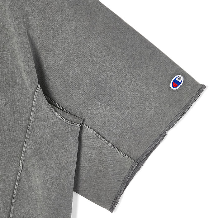 ・立体裁断により身体に沿ったシルエットを実現。端はロックミシン仕上げ。左袖にはチャンピオンの Cロゴワッペンを配置。ネック後ろには両ブランドのロゴを組み合わせた専用タグ付き。
