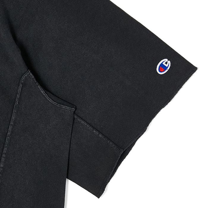 ・立体裁断により身体に沿ったシルエットを実現。端はロックミシン仕上げ。左袖にはチャンピオンの Cロゴワッペンを配置。ネック後ろには両ブランドのロゴを組み合わせた専用タグ付き。