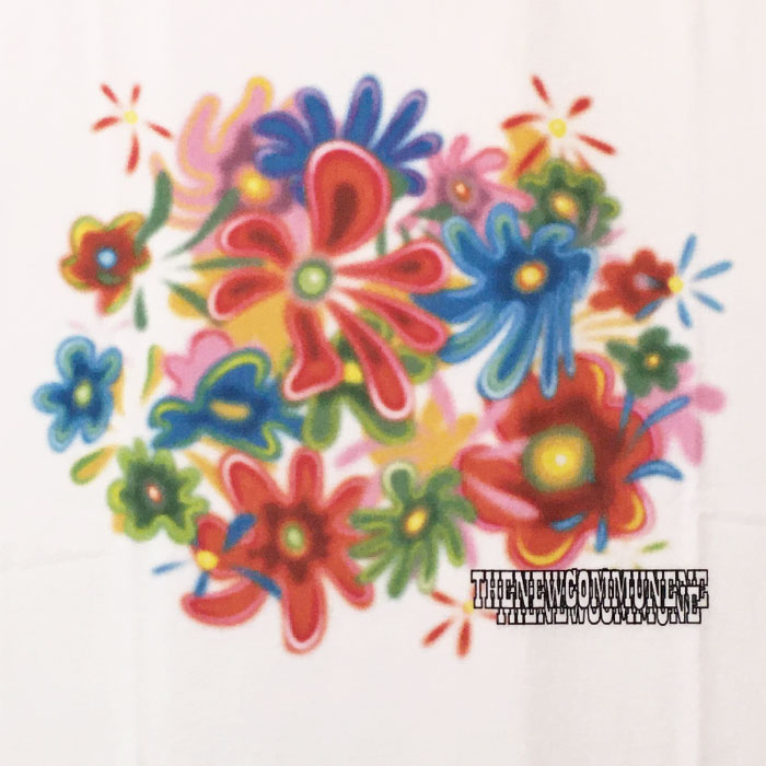 サイケデリックフラワーをフロントにプリントしたTシャツ。
