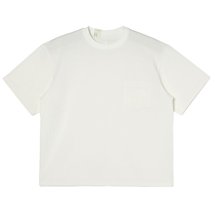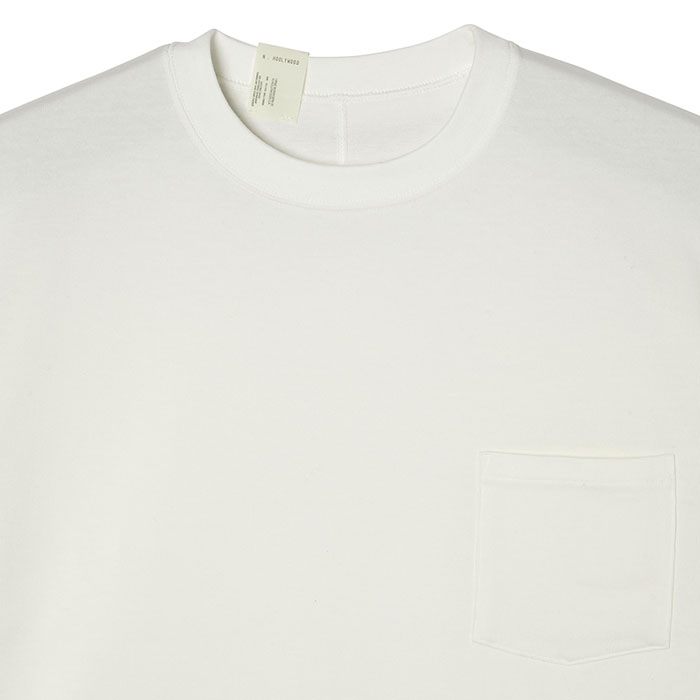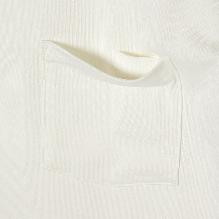 ・希少超長綿のスビンコットンと、発色性の高いオーストラリアコットンをブレンドしたオリジナル糸で編み上げた天竺を使用。アイテムのフォルムを美しく際立たせる、ほどよく肉厚な生地感。肌離れの良いドライなテクスチャーや、絶妙な光沢感が特徴。