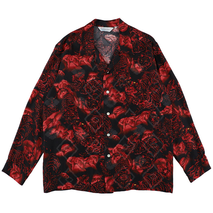 NIPOALOHA ニポアロハ / SILK CUPRO LONG SLEEVE ALOHA SHIRT (ONE HUNDRED TIGERS x BLACK x RED TIGER)